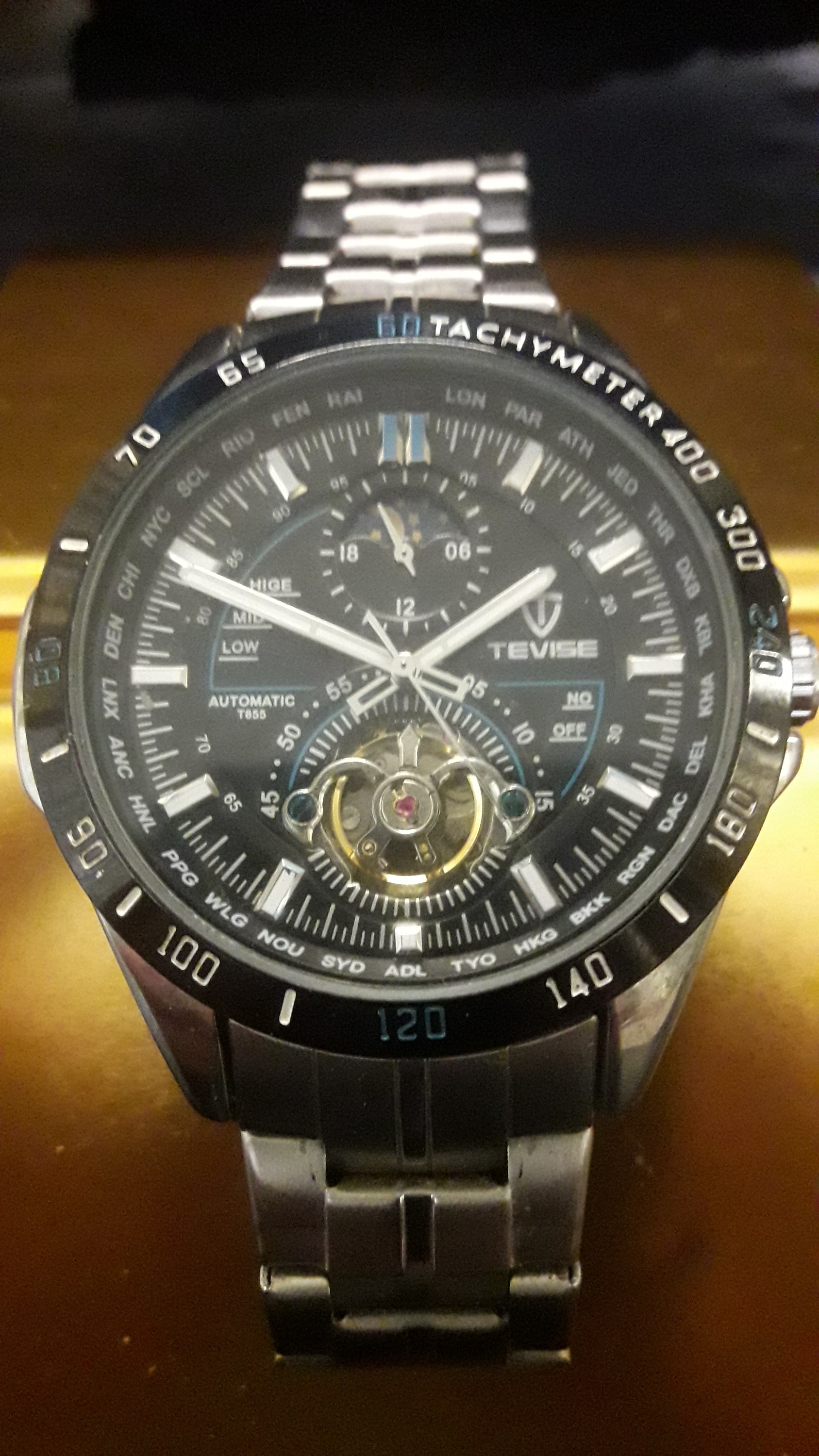 Das Werk ist ein Hangzhuo 2189. Der einzige Nachteil ist, das dieses Werk nicht von Hand aufgezogen werden kann, sondern nur über den automatischen Aufzug. Man muss sie deswegen vor den ersten Anlegen ein paar mal schütteln, aber das war ja bei den billigen Seiko-und Citizen Automatik- Kalibern auch so.“