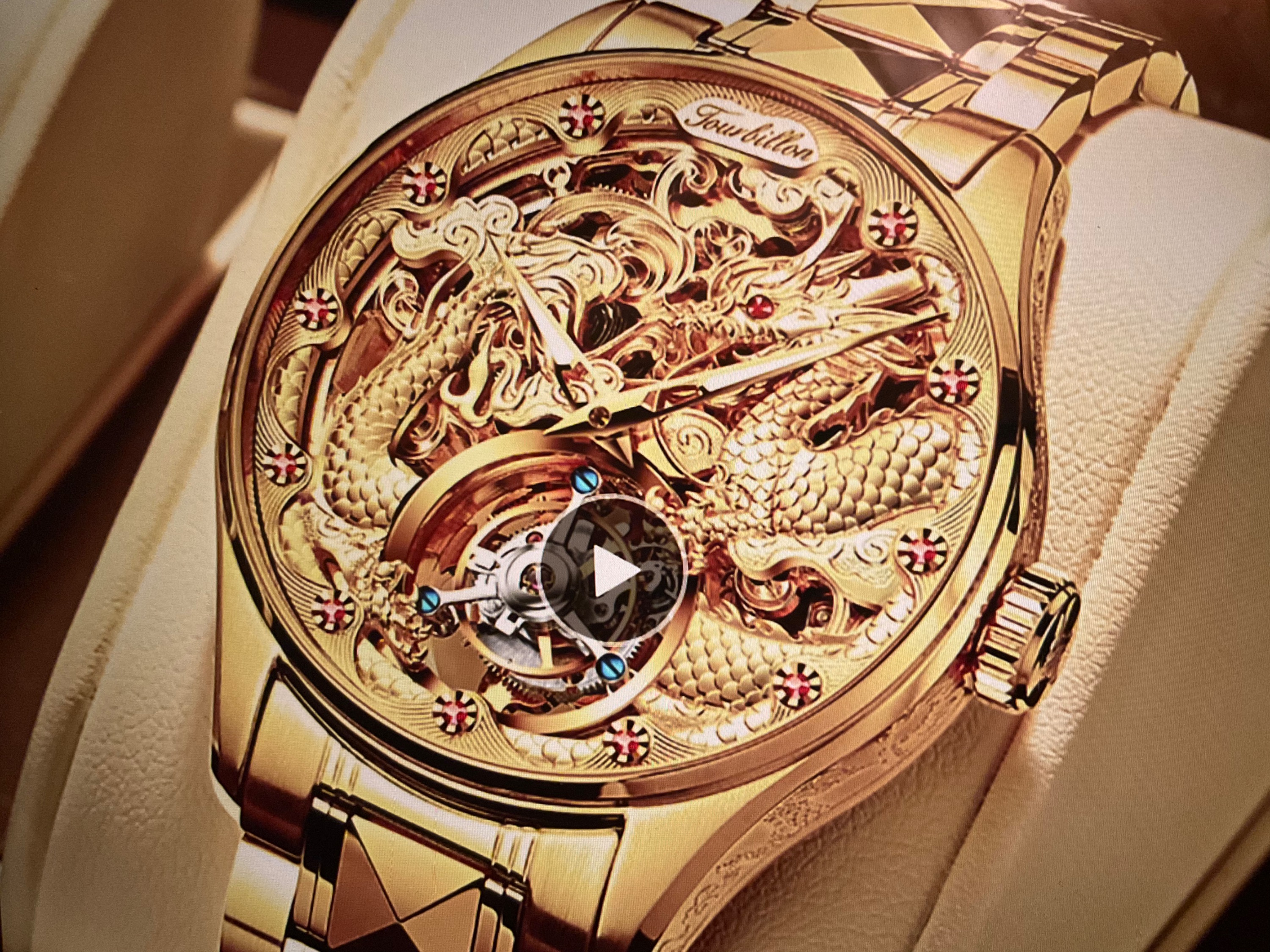 Manche der oben gezeigten Uhren sind echte Tourbillons, z.B. die Uhr mit dem Drachen, d.h. die Hemmungspartie rotiert im Uhrwerk. Da kann man dann auch ein Loch im Zifferblatt durchgehen lassen, mein Geschmack ist es dennoch nicht, die JLC gefällt mir gar nicht, bei der tollen Sattler-Standuhr sieht es gut aus, Daumen hoch. Die Uhr mit dem Drachen ist zwar total überladener Asia-Bling-Bling, aber evtl. sieht die Uhr in echt gar nicht schlecht aus mit dem rotierenden Tourbillon. Die würde ich nicht als schlechtes Design bezeichnen, sondern eher als gut (wenn man auf sehr auffälliges Güldenes steht, das Band ist aussergewöhnlich und passt zur Uhr)