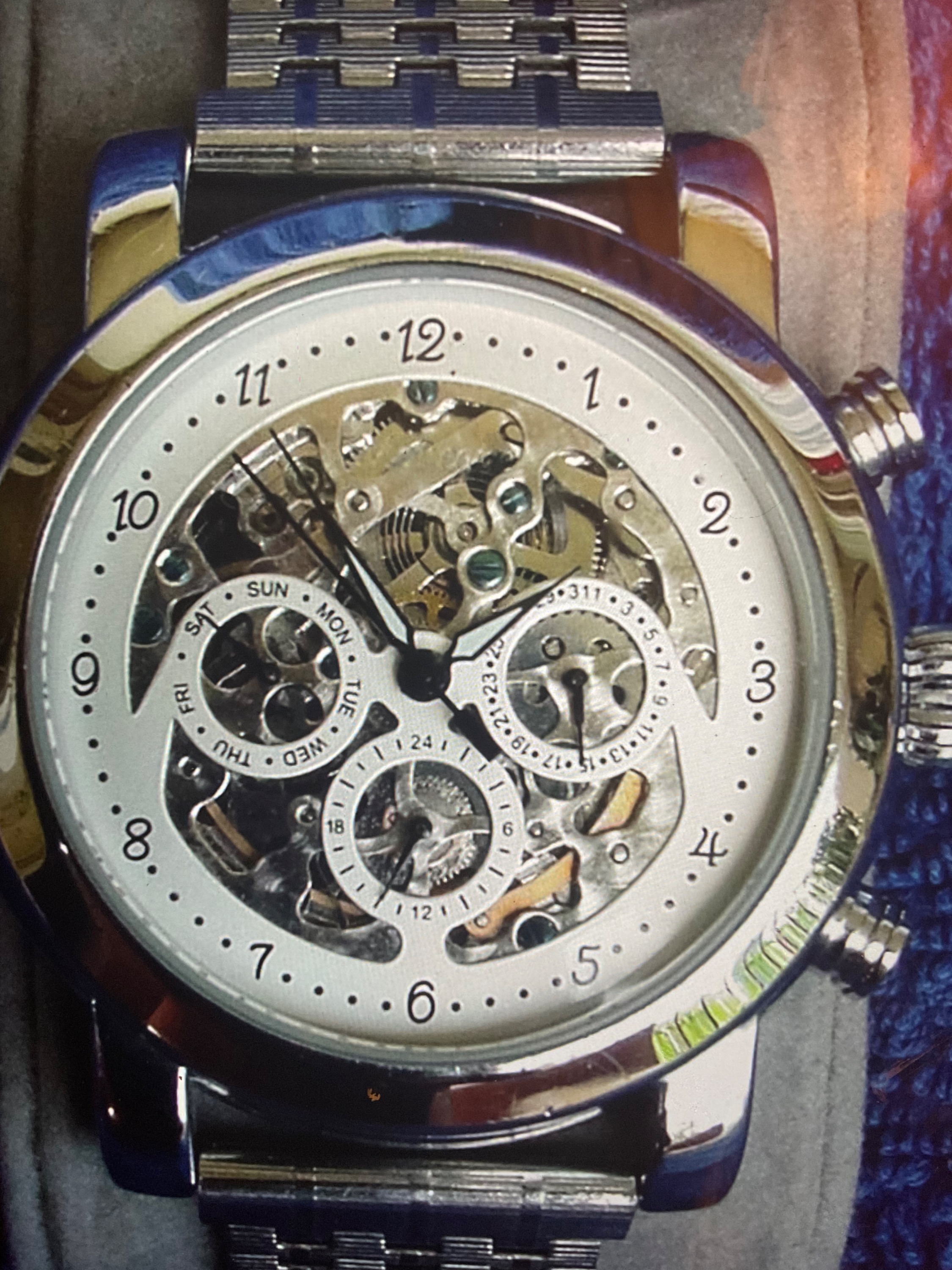 “Wie man sieht ist es eine Chinauhr nach Bauart der berüchtigten Scheinchronographen. Es ist kein Chrono sondern eine Kalenderuhr und die Totalisatoren zeigen Datum, Wochentag und eine 24 Stunden Anzeige an.