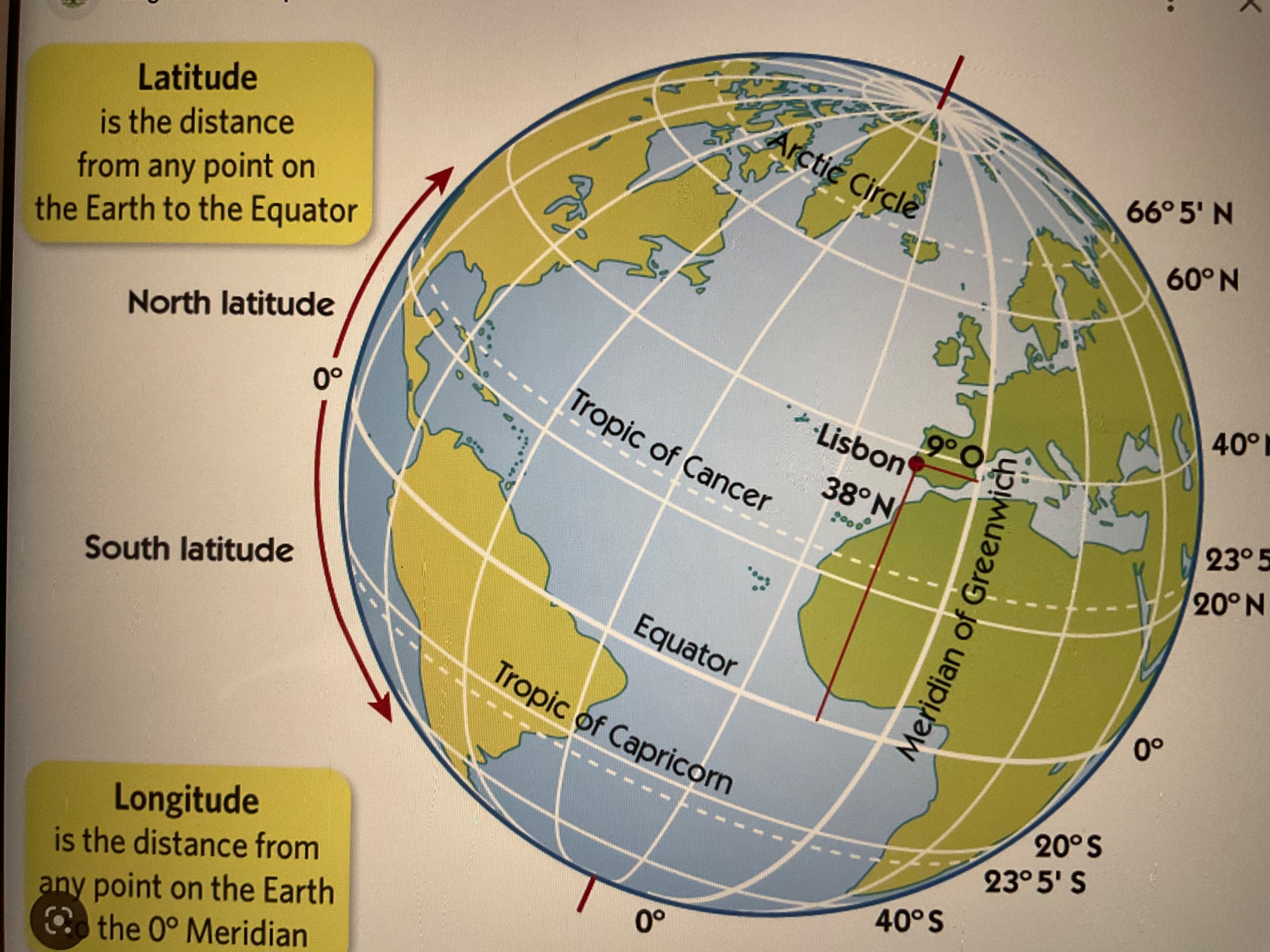 Hier die Erde, mit den Wendekreis des Krebses und des Steinbockes, diese werden wiederum von der Sonne bestimmt, nördliche und südliche Grenze der (scheinbaren) Sonnenbahn, Breiten-und Längengrade und Nullmeridian.