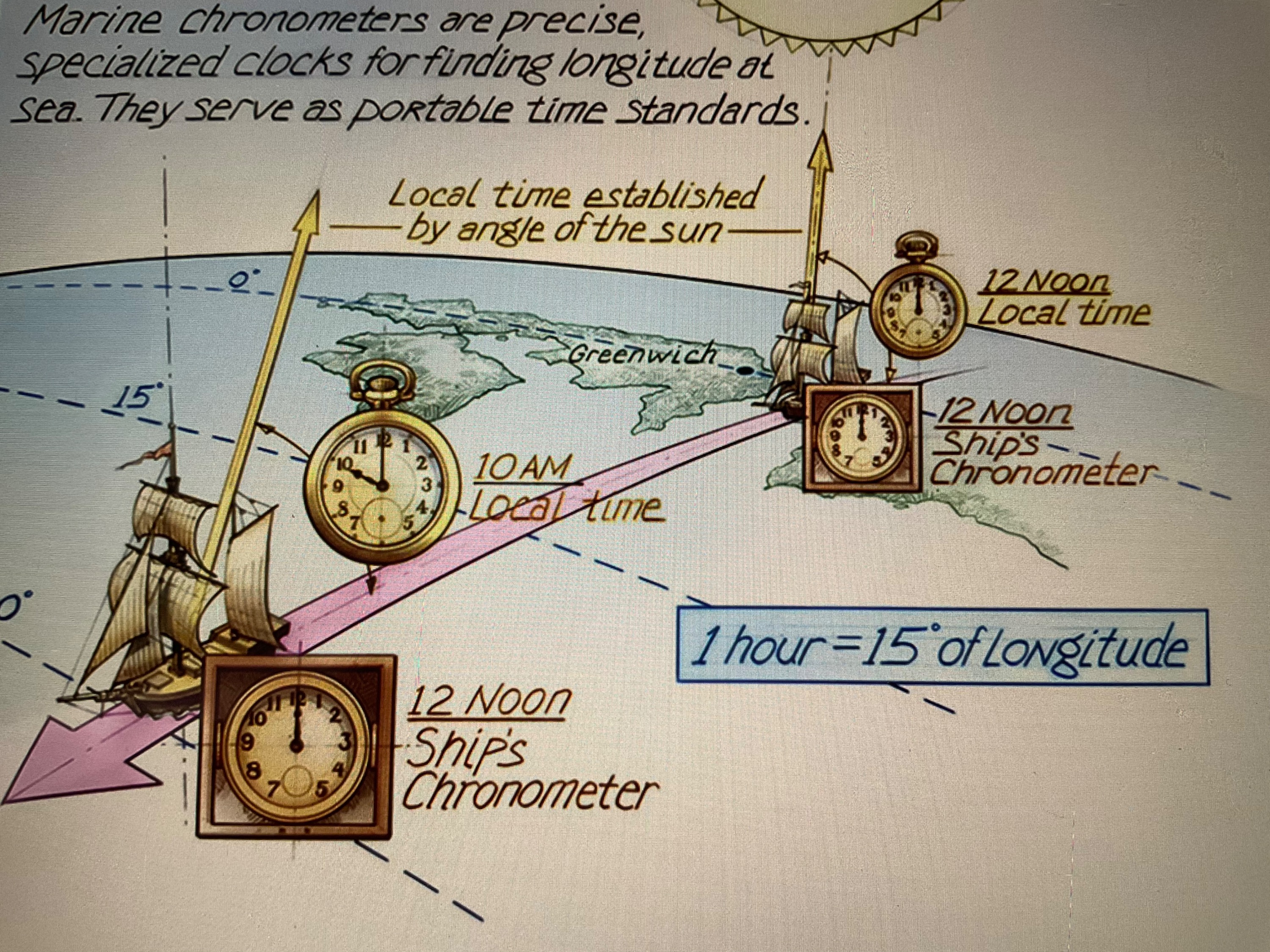Dagegen beruht die Bestimmung des Längengrads auf eine Zeitmessung. Um auf See die geographische Länge zu ermitteln, muß man zwei Zeiten kennen, einmal die Heimathafenzeit und einmal die aktuelle Bordzeit, bzw. den Ort der in der Nähe des Schiffes ist, heute kein Problem mehr mit entsprechenden (Armband) Uhren, die zwei Zeiten anzeigen.