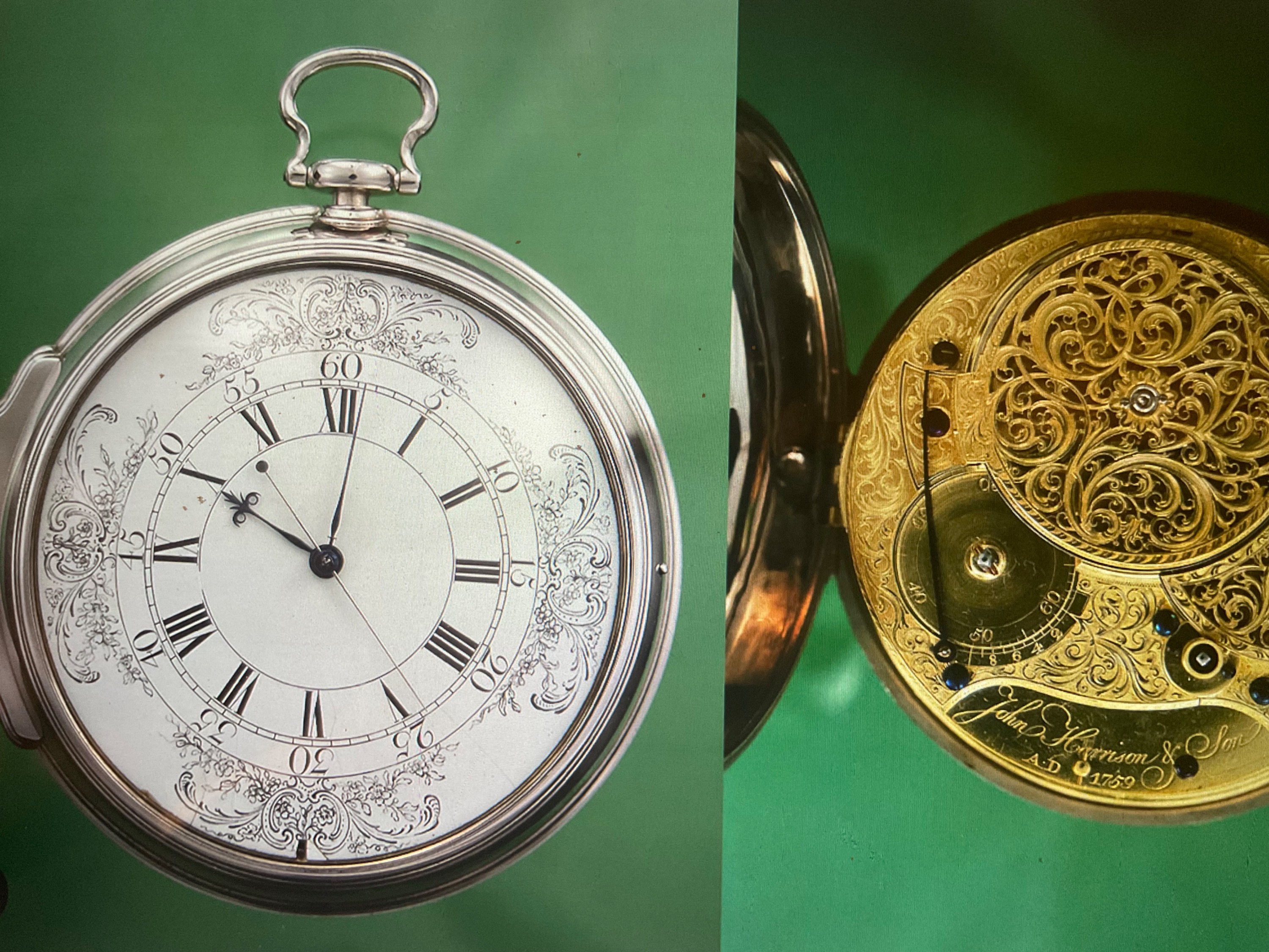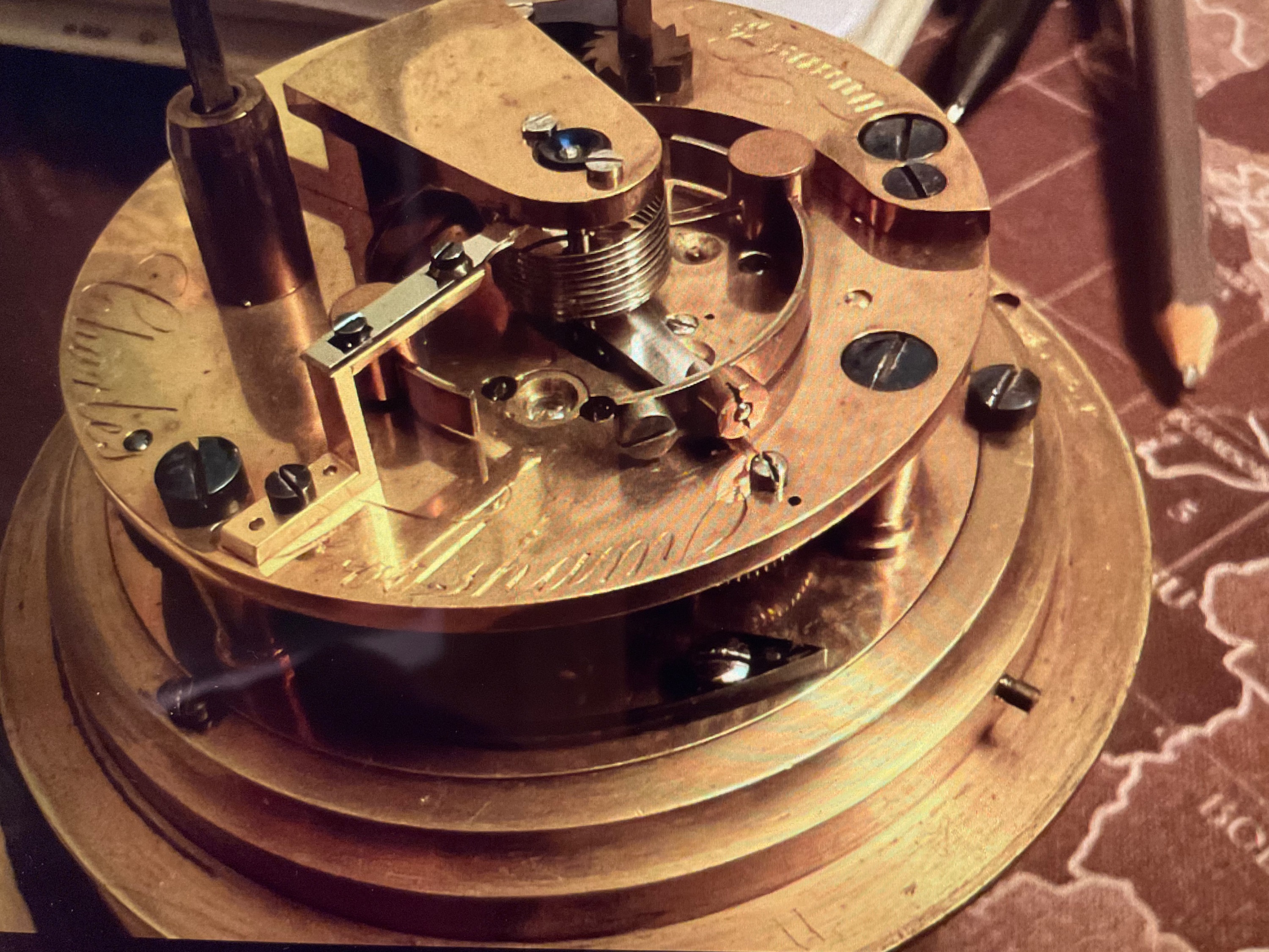 Hier ein Bild seines späteren Schiffschronometer, mit der Innenansicht des Werkes.
