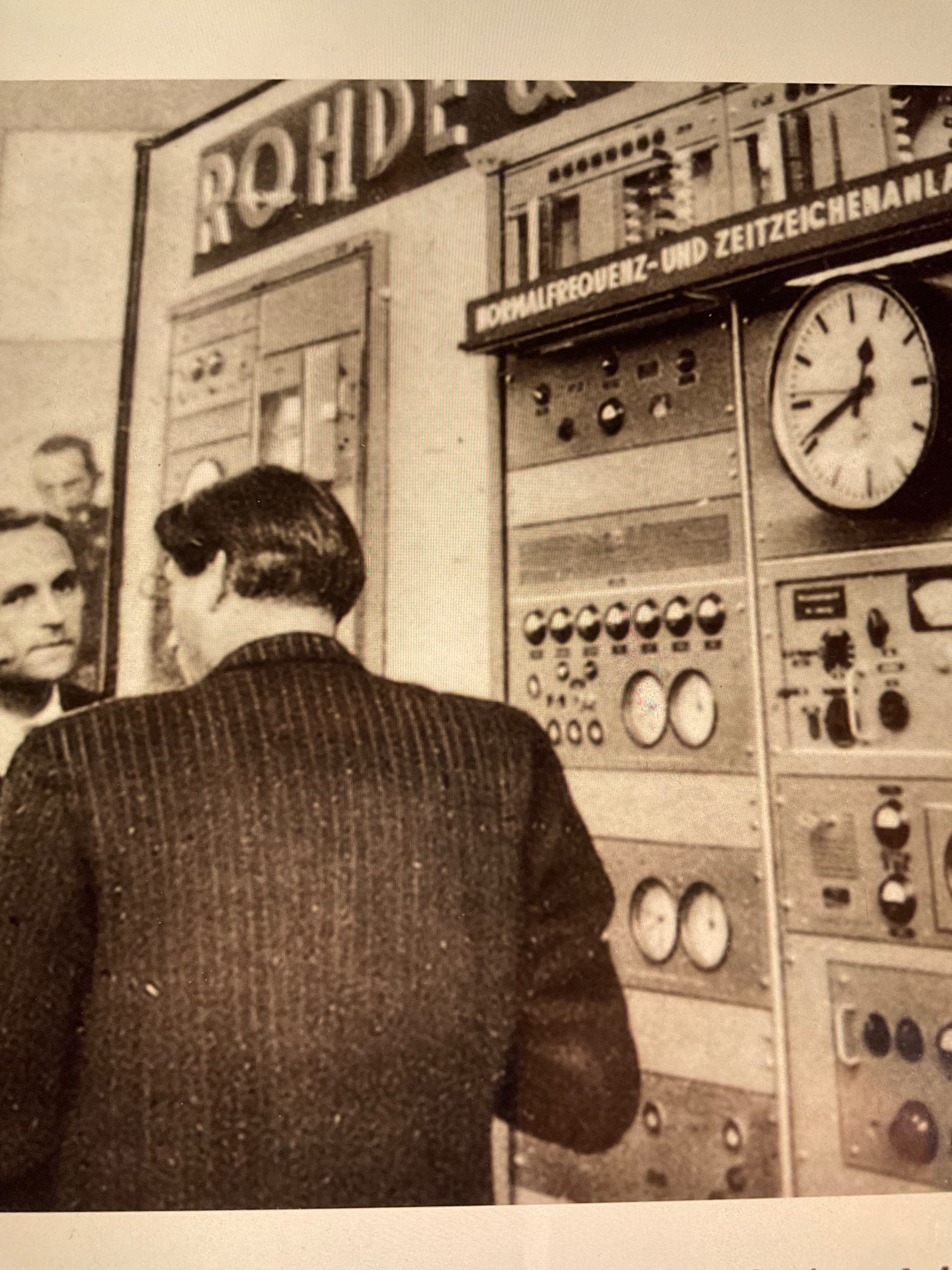 Im unteren Bild der Stand von Rohde & Schwarz von der Elektromesse München 1949 mit einer Normalfrequenz-und Zeitzeichenanlage.