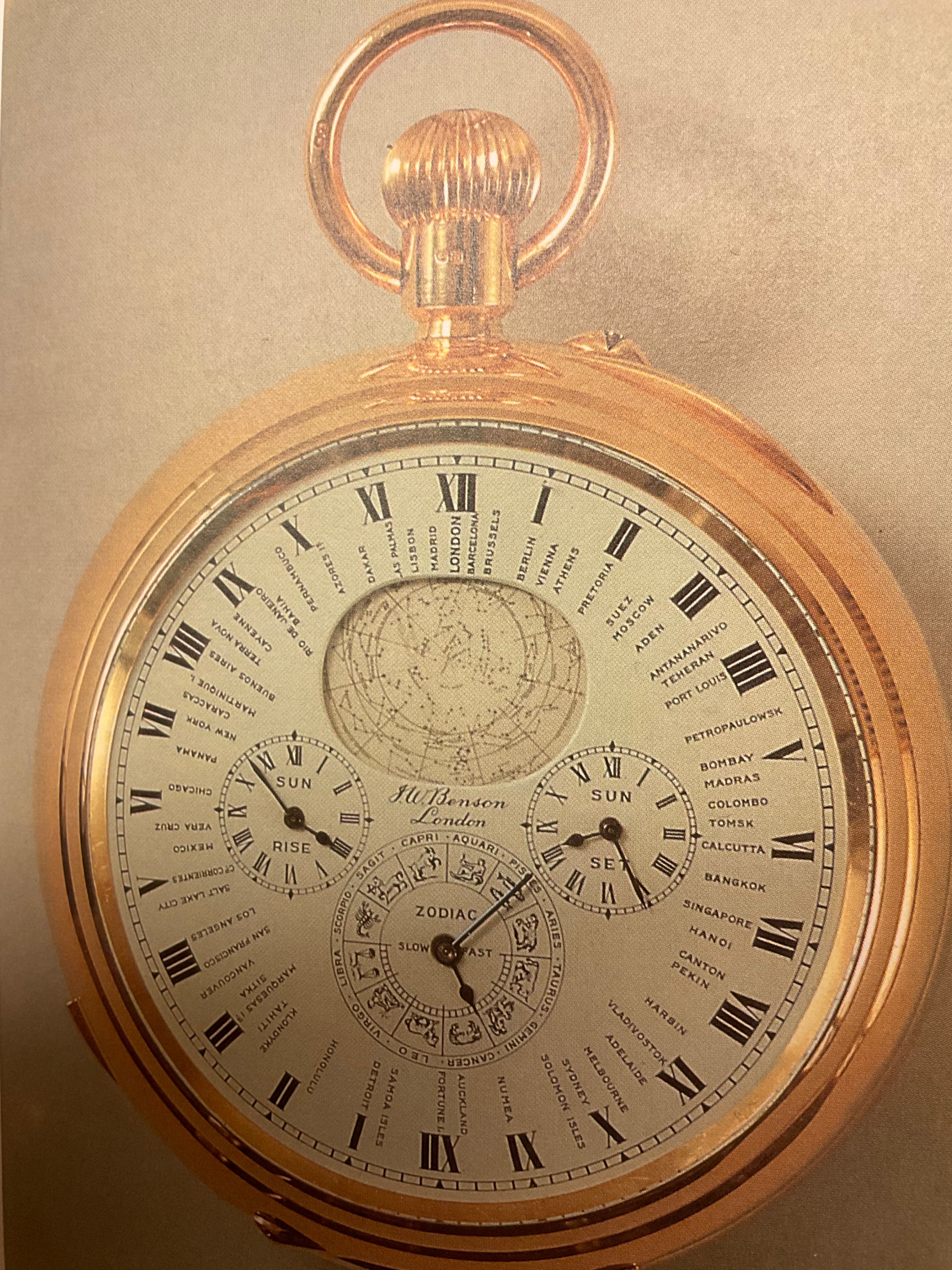 Es handelt sich um die Rückseite der zweiseitigen astronomischen Golduhr. Die Frontseite mit Emailzifferblatt, Stundenzeigern und drei Chronographen. Die Abbildung (Rückseite) zeigt Emailzifferblatt mit Kurvenscheibe für Sonnenaufgang und - Untergang und ewigen Kalender auf kleiner Silberscheibe unter der Lunette. Äquation. Weltzeitangaben für 63 Weltstädte. Nach unten versetzt Tierkreiszeichen mit den Symbolen. Im Fensterausschnitt die Sternenkarte. Wohl komplizierteste Uhr des 19. Jh. mit Spezial-Ankerhemmung, London um 1870.