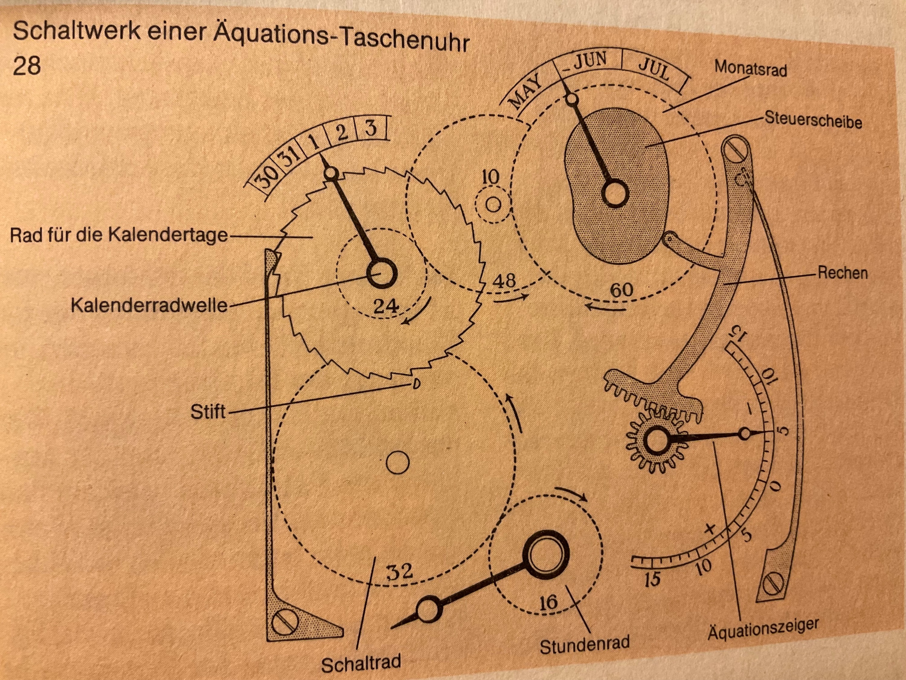 Die Schaltskizze bzw. Mechanismus einer Äquationsuhr in vereinfachter graphischer Darstellung. Die gestrichelten Kreise sind Zahnräder, die Zahlen im Kreis sind die Anzahl der Zähne.Das Stundenrad treibt das Schaltrad an mit 32 Zähnen, dieses braucht für eine Umdrehung doppelt so lange wie das Stundenrad, nämlich 24 Stunden. Aus seiner Fläche ragt ein Stift, der das Rad für die Kalendertage 1-31 alle 24 Stunden um einen Zahn ist gleich ein Tag, weiterrückt! Dies alles wird auf das Rad mit den Monatszeiger übertragen, das für einen vollen Umlauf ein Jahr braucht. Ganz grob und gekürzt hier von mir wiedergegeben! Das alles ist nicht willkürlich gewählt, sondern nach den Werten der Zeitgleichungstabelle genau berechnet und diese Werte werden auf der Äquationsskala angezeigt!