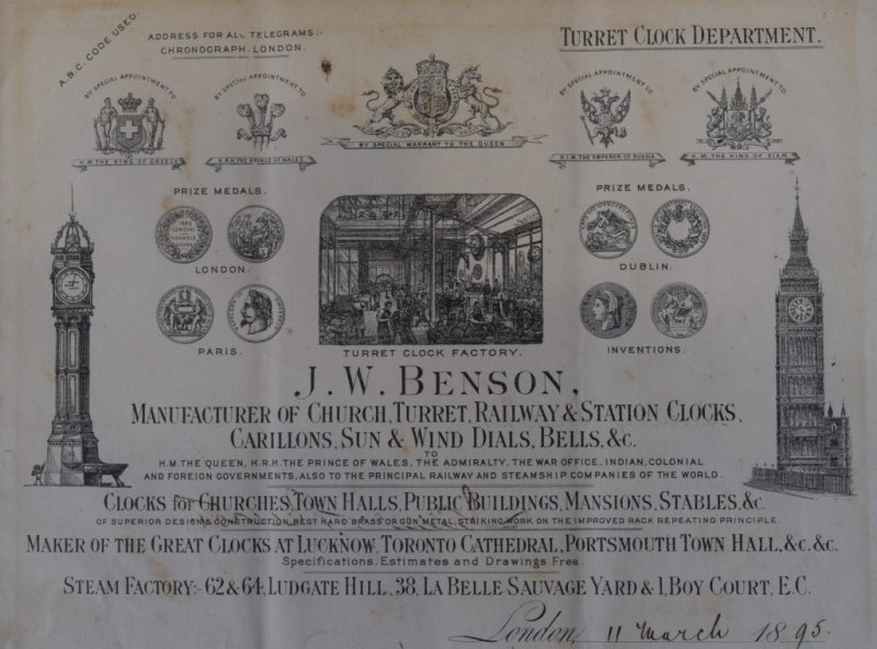 Benson war ein Multitalent! Hier seine Werbeanzeige für die Reparatur von Turmuhren 1895!