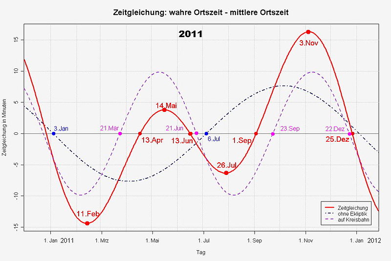 Die Wahre und die Mittlere Ortszeit sind nicht einmal im Jahr ("am 15. April") gleich, wie der Text schreibt, sondern viermal, man kann in dem linearen Diagramm auch die Daten ablesen, dort wo die Wellenlinie (= Mittlere Ortszeit) die horizontale Gerade / Null-Linie (= Mittlere Ortszeit) schneidet: 13.04. / 13.06. / 01.09. / 25.12. (für 2011, kann um 1 bis 2 Tage verschoben sein in anderen Jahren)