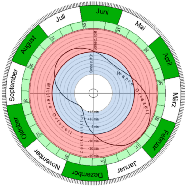 Wenn man also immer genau 24 Stunden später wieder schaut, wo die Sonne steht, müsste sie wieder genau im Süden stehen. Als man dies vor einigen hundert Jahren tat, merkte man, dass zu manchen Zeiten im Jahr die Sonne zu früh dran war, sie hatte den Meridian bereits überschritten und stand schon ein Stück weit westlich davon. Zu anderen Zeiten im Jahr war sie zu spät und stand noch östlich vom Meridian. Das liegt daran, dass die Erdumlaufbahn kein Kreis, sondern eine Ellipse ist (Einflüsse der Obliquität und der Exzentrik) und daher ein Tag nicht immer genau 24h lang, sondern variabel und der Mittagszeitpunkt mehr als eine Viertelstunde nach plus und minus abweichen kann.