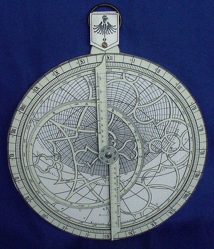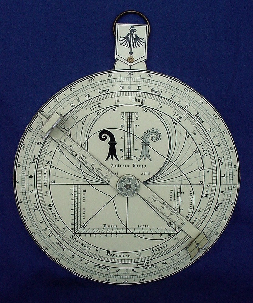 Rückseite eines von mir entworfenen Astrolabiums. Die einzige modernere Zugabe (auch schon ein paar hundert Jahre im Gebrauch) ist das Nierendiagramm zum Umrechnen der Wahren (gemessenen) Ortszeit in die Mittlere Ortszeit (diese wird dann in die Zonenzeit umgerechnet).