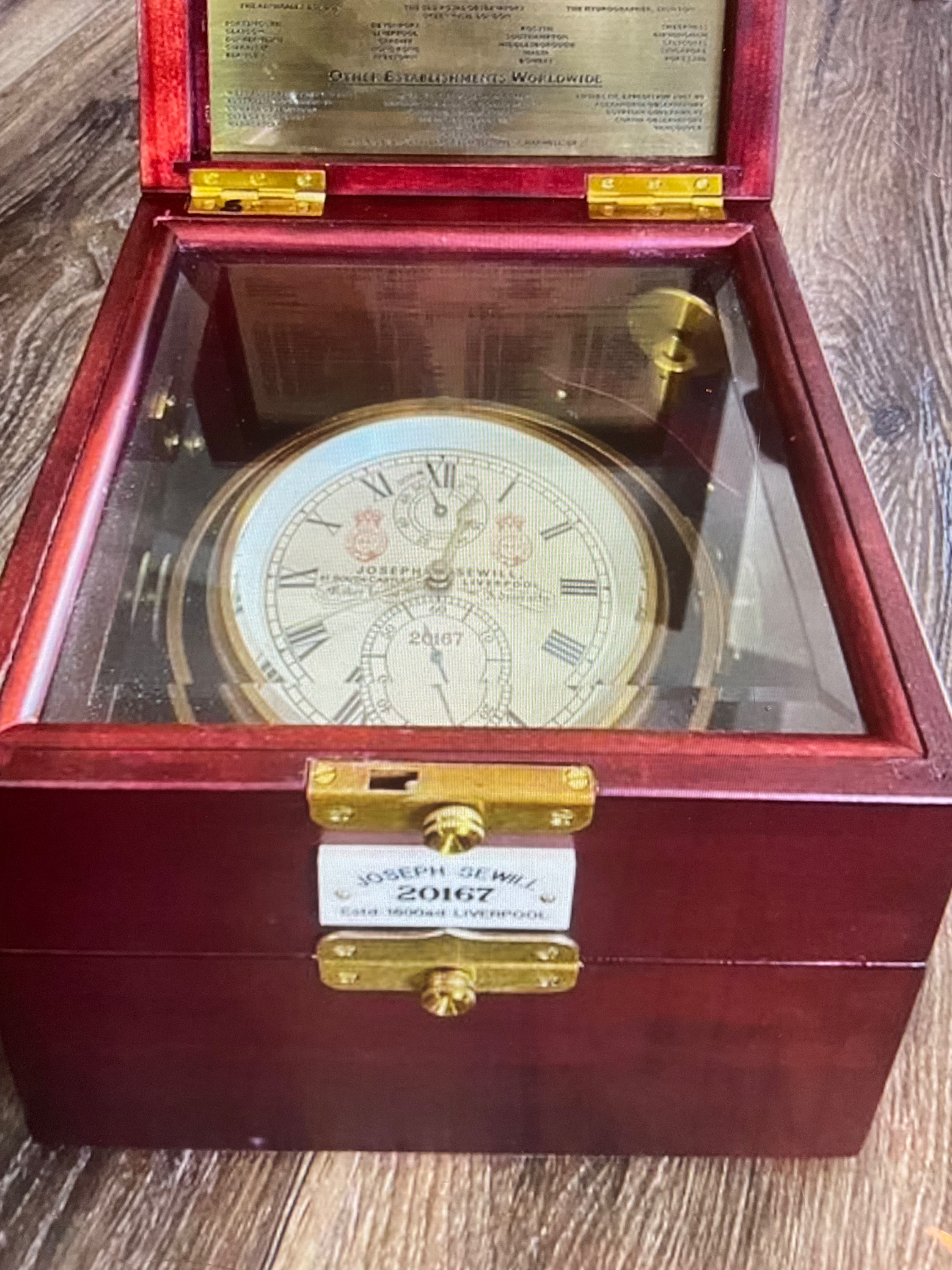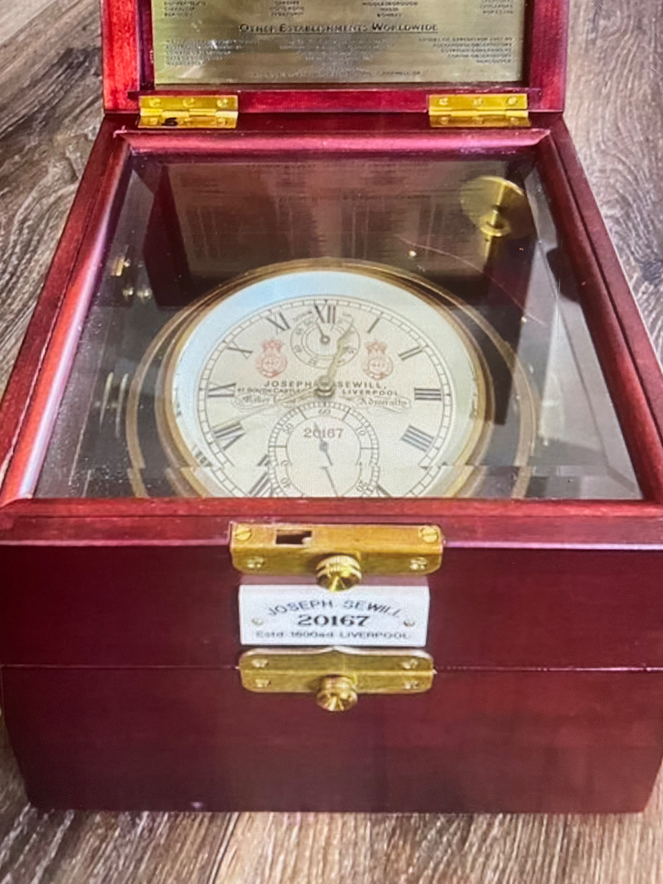 Das oben gezeigte Gehäuse gehört zu einen Poljot Werk MX6, das untere Werksgehäuse gehört zu einen Watchmaker in Liverpool, namens Joseph Sewill! Also ist an der Uhr etwas zusammengeschustert. Denn das Zifferblatt ist von Sewill, und auch das Etikett an der Frontseite verweist auf Sewill, nachträglich angebracht! Denn die komplette Holzbox mit Werk ist wiederum von Poljot. Was das Ganze soll, ich weis es nicht?