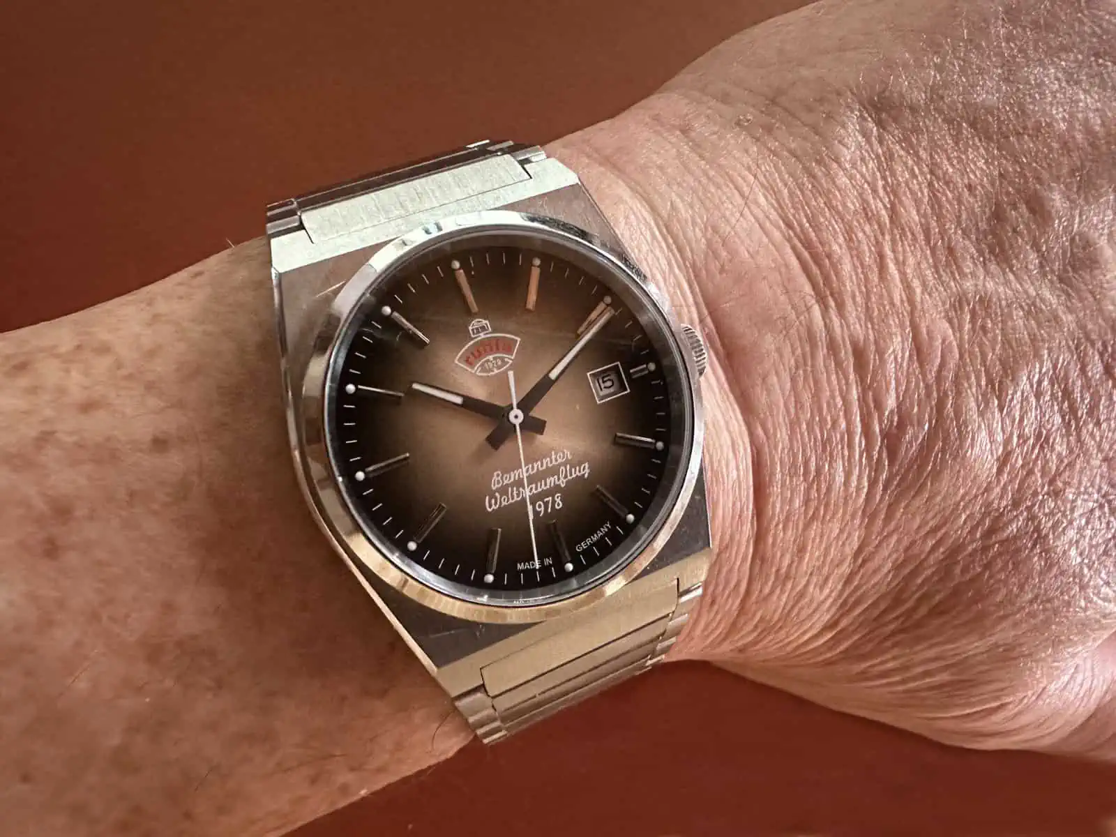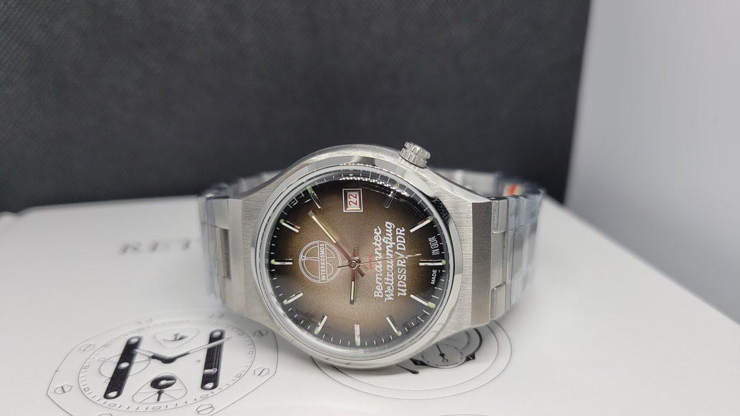 Die Uhr ist von vorn nicht zu unterscheiden von der extrem seltenen braunen Widmungsuhr von 1978, sie sieht also scheinbar exakt wie das Vorbild aus, von dem sie angeblich ein Reissue ist. Das Zifferblatt trägt sogar die Aufschrift "Made in GDR".