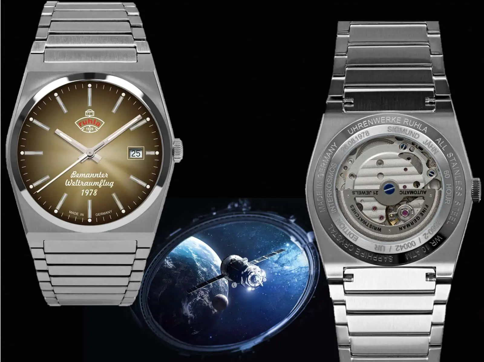 / Sigmund Jähn, der erste Deutsche im All, trug bei seinem Weltraumflug 1978 eine speziell für diese Mission produzierte Armbanduhr der Marke Ruhla am Handgelenk. Nun wurde das ikonische Design dieses Zeitmessers neu interpretiert und ist, ausgestattet mit moderner Technik, bereit für neue Abenteuer. Das Zifferblatt der „Sigmund Jähn“ Sonderedition orientiert sich eng an dem historischen Vorbild, das Sigmund Jähn bei seinem Weltraumflug 1978 am Handgelenk trug. Beim späteren Verkauf dieser Uhren im Handel durch die historische Uhrenmarke Ruhla blieb die Zifferblattfarbe Braun-Degradée außen vor – diese war ausschließlich den Kosmonauten vorbehalten. Nun bringt Ruhla diese Farbvariante in der neuen Space Control zurück – ein interessantes Stück Geschichte fürs Handgelenk. Das Automatikwerk kann durch den Glasboden betrachtet werden und verfügt über eine Gangreserve von 60h. Weitere Automatik-Modelle sind erhältlich, sowie Varianten mit unsichtbar verbautem Solarwerk.