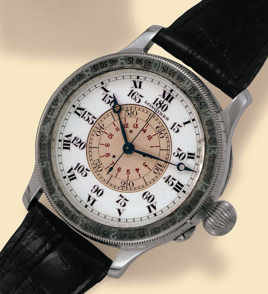 Die Erde dreht sich in 24 Stunden einmal um ihre Achse. In zwölf Stunden um 180 Grad, in einer Stunde um 15 Grad und in der Minute um 15 Bogenminuten. Lindberghs Erfindung machte es möglich, dass die Zeiger der Uhr nicht nur die exakte Uhrzeit darstellen konnten, sondern auch den zugehörigen Greenwich-Stundenwinkel der Sonne. Eine Stunde entspricht dabei 15 Grad. Wenn der Stundenzeiger in zwölf Stunden das Zifferblatt umrundet hat, hat er also die 180-Grad-Position erreicht. Die dem Minutenzeiger zugehörige Skalierung auf der Lünette unterteilt die 60 Minuten einer Stunde in 15 Grad, wobei jede Minute für 15 Bogenminuten steht. Der Sekundenzeiger wiederum zeigt auf dem kleinen, verstellbaren Zifferblatt in der Mitte die exakte Anzahl der Bogenminuten zwischen null und 15, die in einer Minute verstreichen.Nun könnte man den Greenwich-Stundenwinkel der Sonne wie folgt ablesen: Nehmen wir an, dass die Stundenwinkeluhr von Longines 4 Uhr 37 Minuten und 9 Sekunden zeigt. Nach dem Empfang des Zeitnormals via Zeitzeichensender korrigieren wir das kleine Hilfszifferblatt in der Mitte um plus drei Sekunden, sodass wir jetzt über die sekundengenaue Zeit verfügen. Es ist demnach 4 Uhr 37 Minuten und 12 Sekunden. Der Stundenzeiger zeigt uns 60 Grad an, der Minutenzeiger 9 Grad und 15 Bogenminuten, der Sekundenzeiger 3 Bogenminuten. Addiert man das Ganze, so kommt man auf 69 Grad und 18 Bogenminuten. Dieser Wert stimmt jedoch nur, wenn die Differenz zwischen der wahren und der mittleren Sonnenzeit null ist. Variiert diese, und das tut sie in einem Ausmaß von plus 16 Minuten um den 3. November und minus 14 Minuten um den 11. Februar, so muss diese Varianz in unsere Berechnungen einbezogen werden.Auch daran hatte Charles A. Lindbergh gedacht, indem er die Lünette drehbar und somit korrigierbar vorsah. Nehmen wir wieder an, dass unsere Longines 4 Uhr 37 Minuten und 12 Sekunden anzeigt. Dieses Mal gibt es aber durch die Zeitgleichung eine Verschiebung zwischen der wahren und der mittleren Sonnenzeit von minus 4 Minuten und 50 Sekunden. Wir drehen die davor noch mittig stehende Lünette jetzt um 4 Minuten nach links und lesen Folgendes ab: Der Stundenzeiger zeigt uns wieder 60 Grad an, der Minutenzeiger jetzt aber 10 Grad und 15 Bogenminuten und der Sekundenzeiger wieder 3 Bogenminuten. Da wir zuerst jedoch die 50 Sekunden beim Verdrehen der Lünette nicht berücksichtigt hatten, da diese kaum einstellbar sind, müssen diese jetzt noch in unserer Rechnung einfließen. Auf dem kleinen Zifferblatt lesen wir für die 50 Sekunden 12½ Bogenminuten ab und addieren diese mit den anderen Zahlen zu einem Wert von 70 Grad und 30½ Bogenminuten für den Greenwich-Stundenwinkel der Sonne.