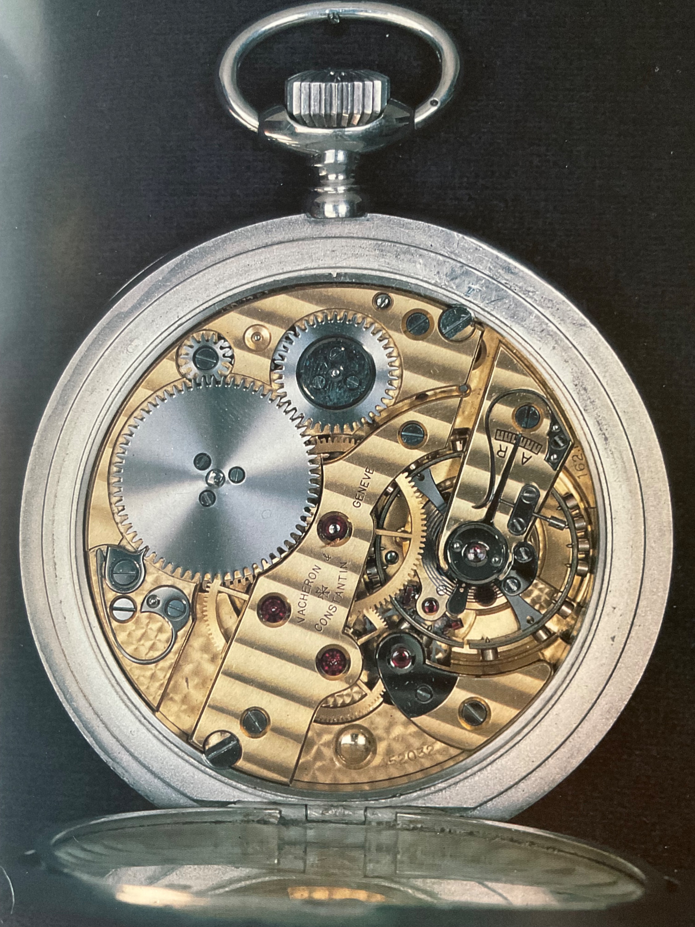 Es ist von Vacheron / Ch. gefertigt, und gehört zur späteren Epoche dieser Uhren. Vergoldetes Einzelbrückenwerk , Genfer Streifen, 21 Rubin, Ankergang, Guillaume Unruhe, Brequet Spirale, Schwanenhalsfeinregulierung
