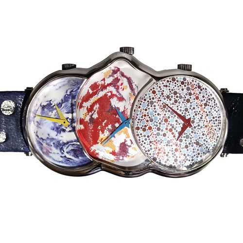 Die Zifferblätter sollen verschiedene Ansichten der Erde vom Weltall aus darstellen. Das erste Bild ist der Blick auf die Erde von einer elliptischen Umlaufbahn aus. Das zweite Bild oder Zifferblatt zeigt die Erde durch einen Meteoriteneinschlag, durch dem die Erde zu schmelzen beginnt. Dadurch das verformte Gehäuse. Das dritte Bild soll wiederum die Erde symbolisieren, nach den Neubeginn.