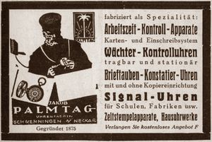 Hier noch eine historisch, alte Werbung der Firma Palmtag, die besonders durch ihre Wächter- Kontrolluhren innovatives geleistet hat. Ich selbst bin im Besitz von mehreren elektrischen Uhren der Firma Palmtag. Werde in meinen Fotoarchiv danach suchen, bei Erfolg dann hier Abbildung.