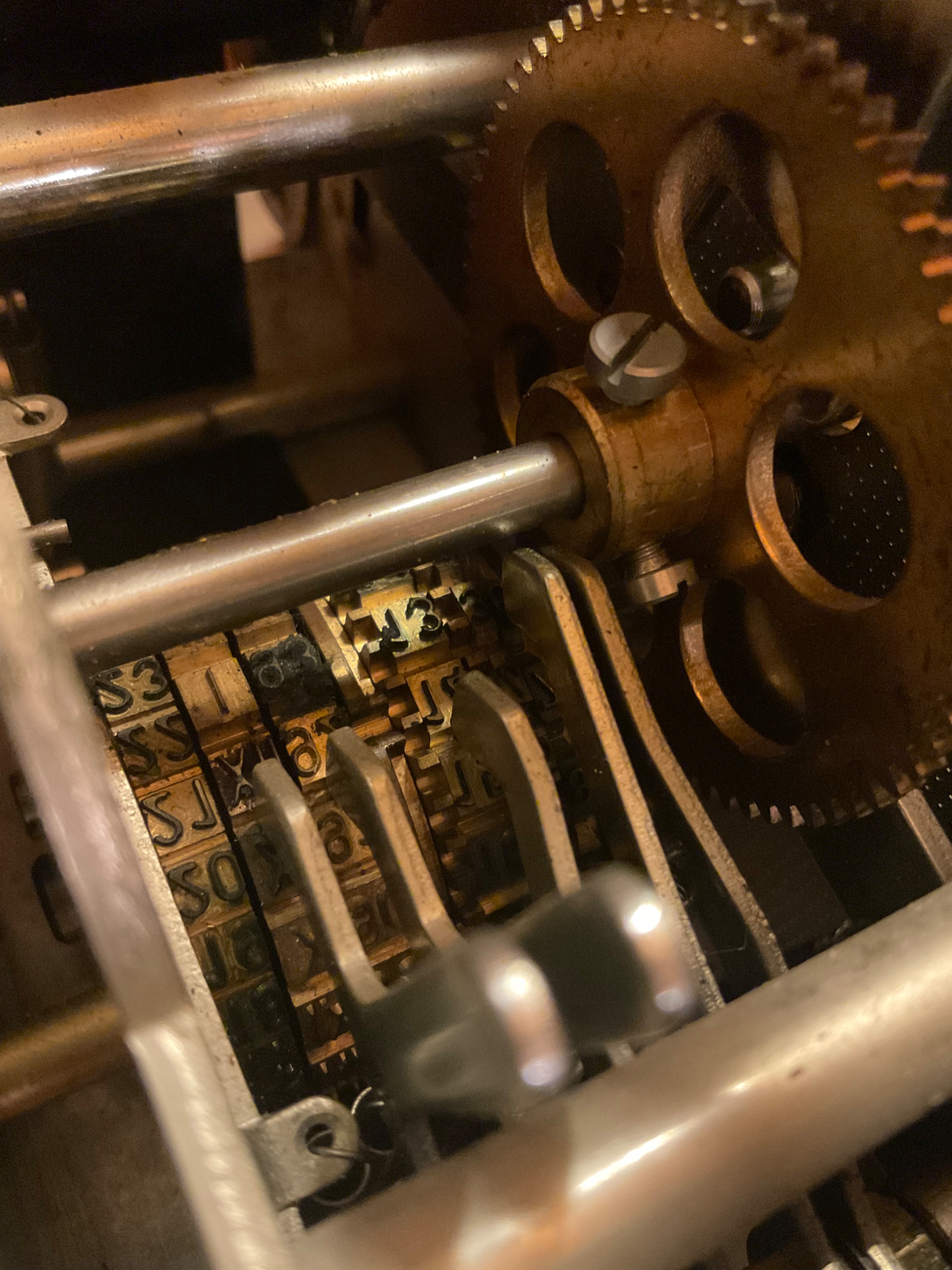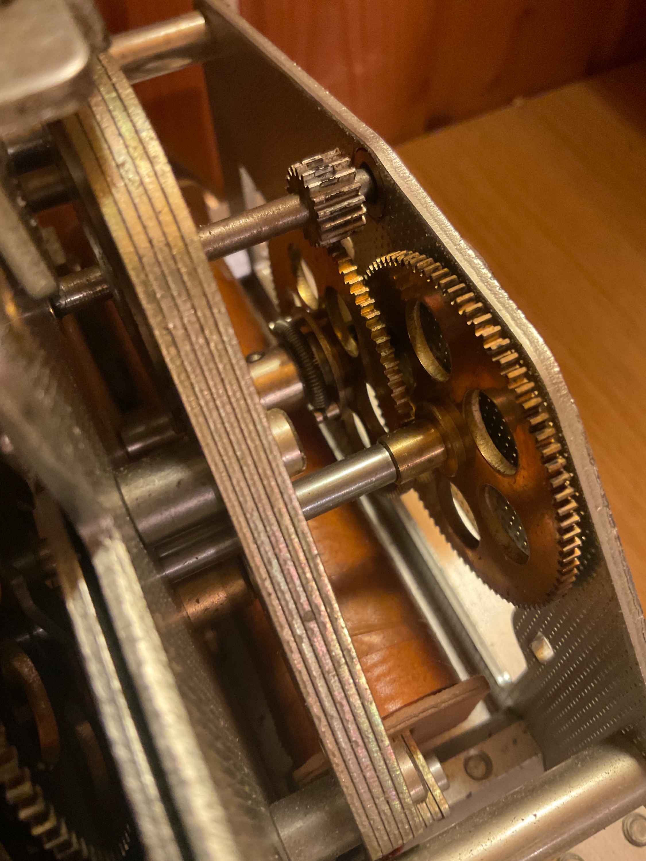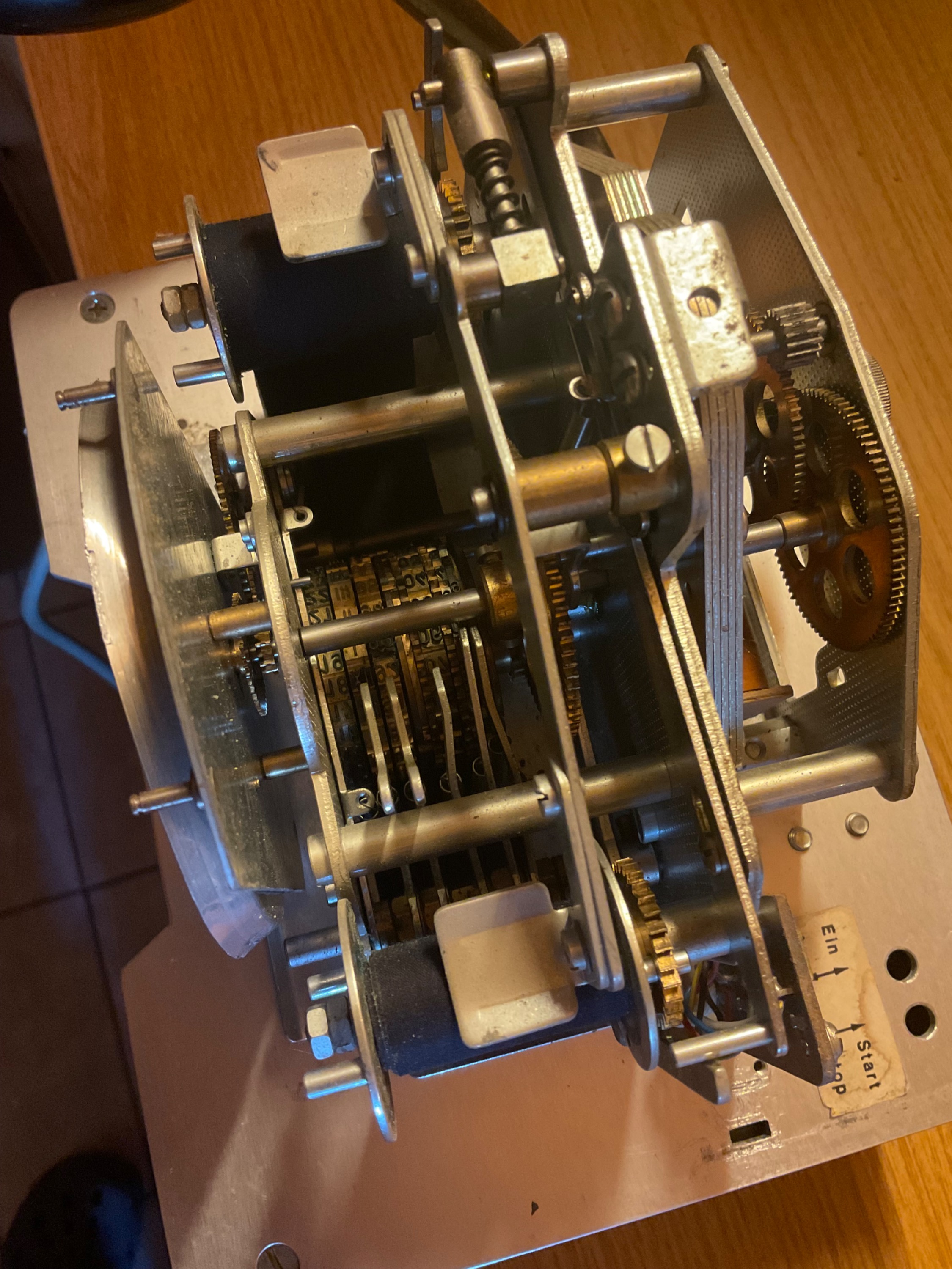Hier der Kartenapparat „Rochester“ mit drei Federhäuser für Uhrwerk, Kalenderwerk und automatische Kartenverstellung