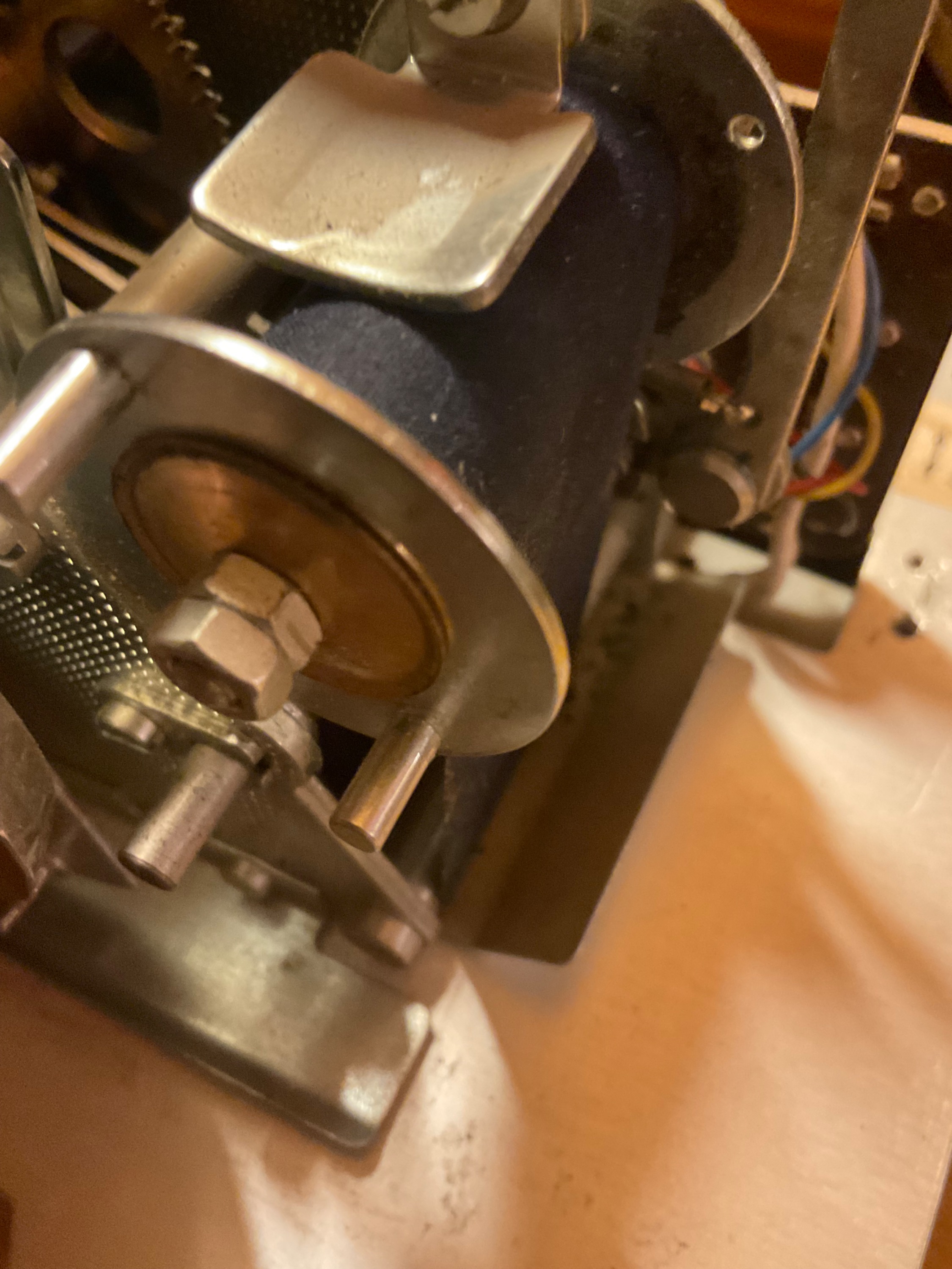 Die Fächerscheibe rechts, wird vom Uhrwerk links, ausgelöst, und läßt zu bestimmter Zeit eine Blechmarke mit aufgedruckter Uhrzeit in den Schacht fallen. Der Einwurfschlitz für die Blechmarke ganz unten, auf den Foto nicht mehr ersichtlich.