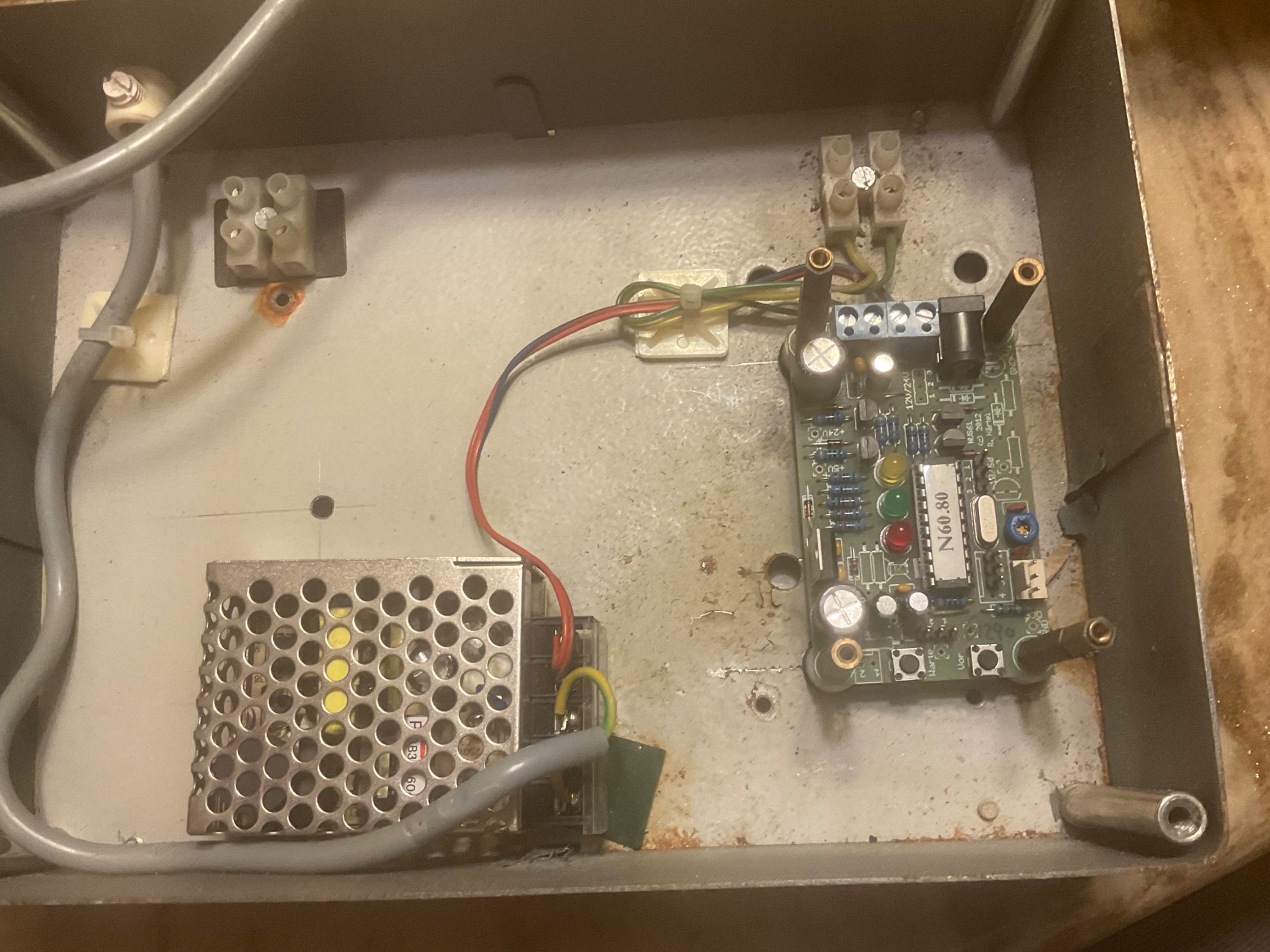 Hier der innere Teil, die Stromkabel-Zuführung links, zum Transformator Modul,