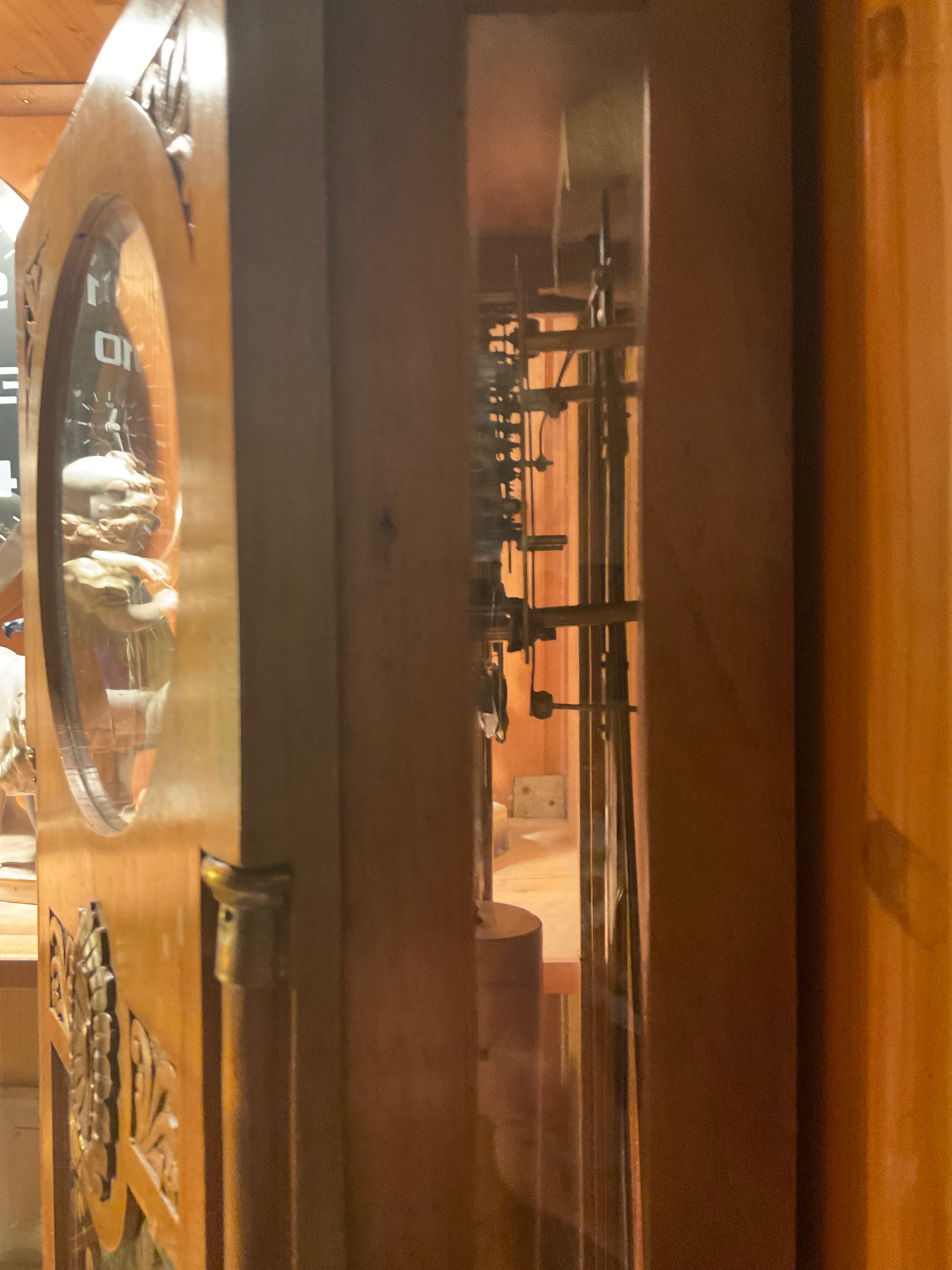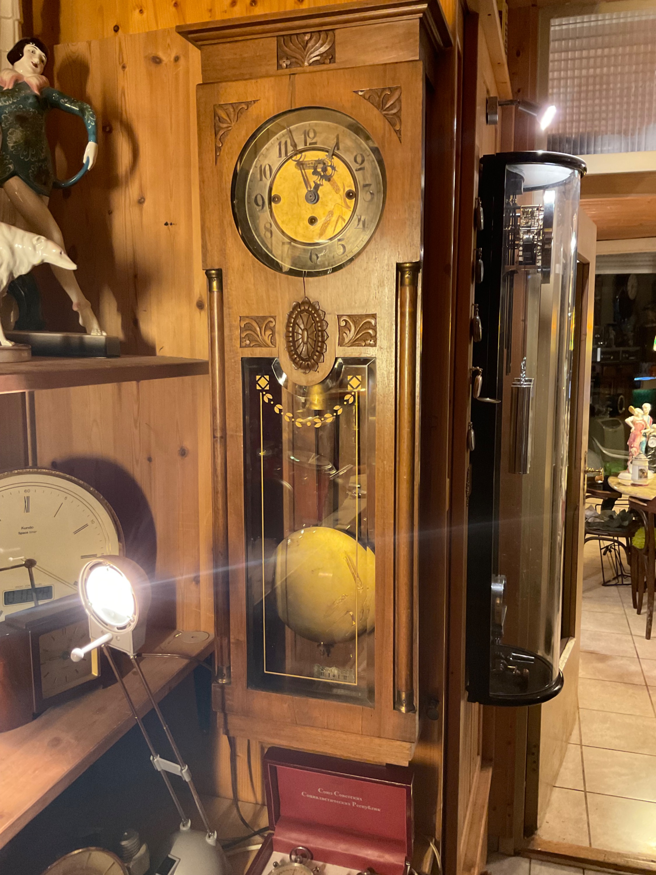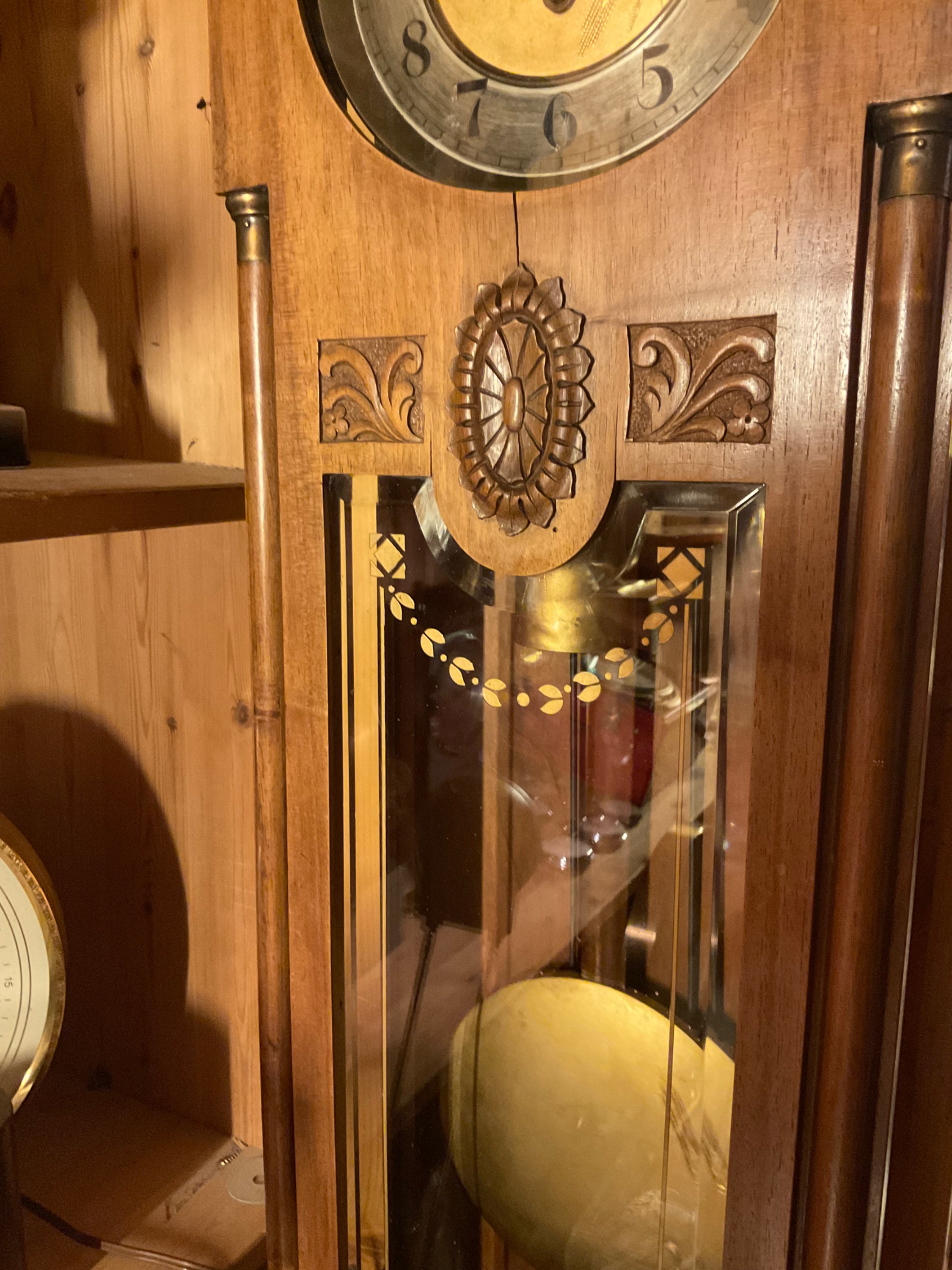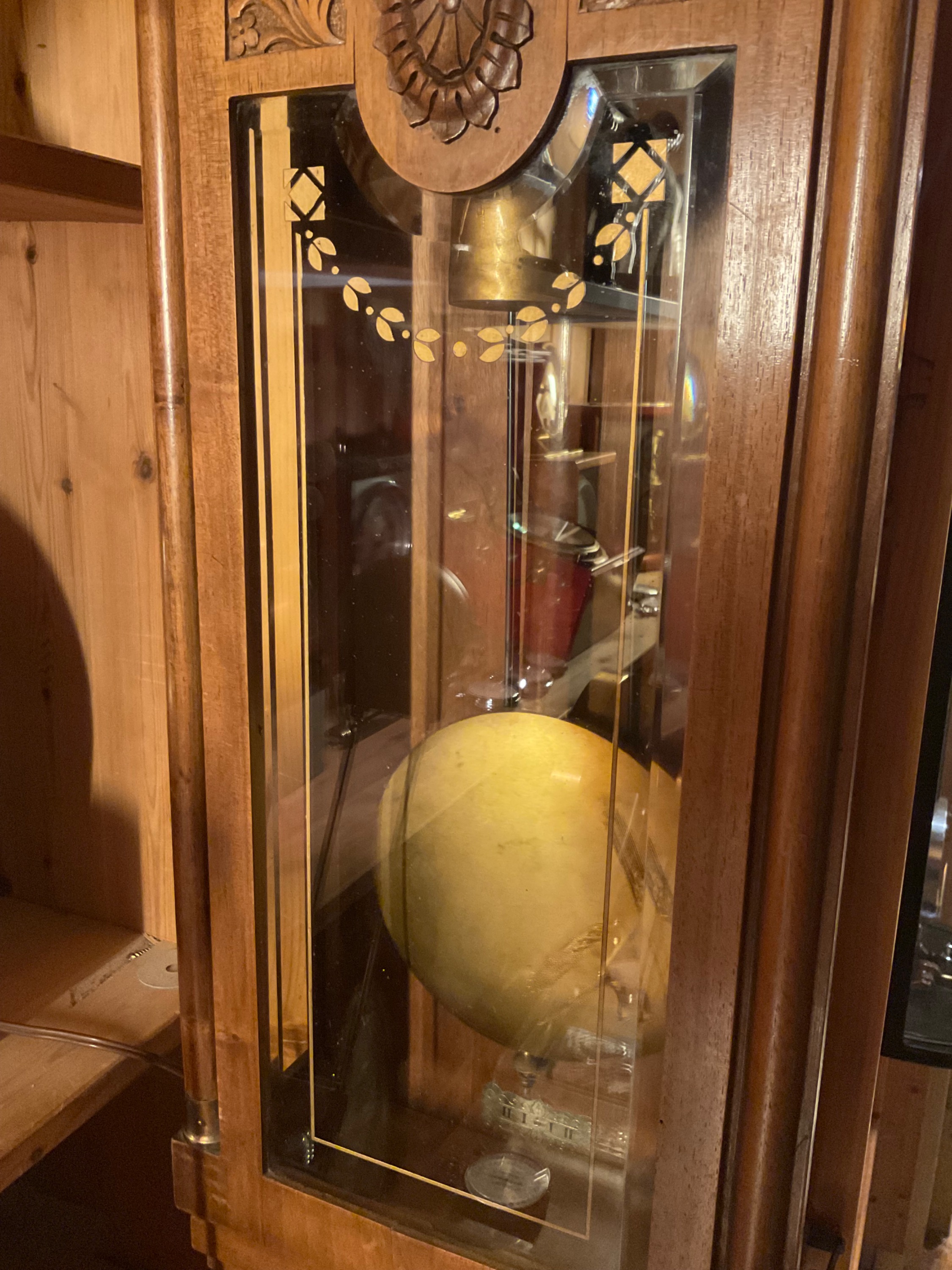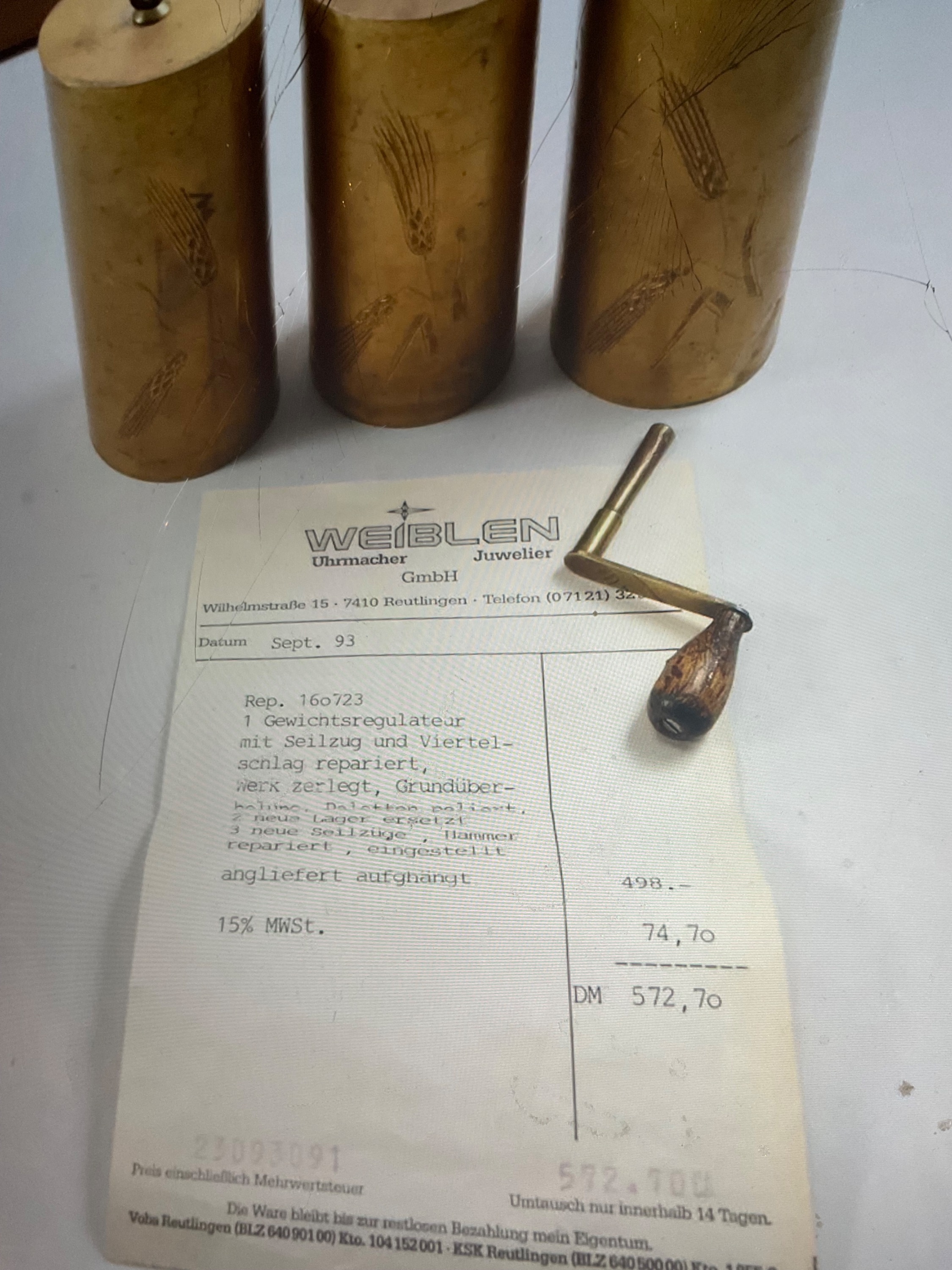 Ein Riß durch die Furnitur von oben bis unten (gut die Uhr ist über hundert Jahre alt, verziehen). Die Zeiger lose aufgesteckt, die Pendellinse überdimensioniert, die Gewichte, besser für eine Kirchturmuhr geeignet, viel zu schwer, die Quintessenz daraus, das Werk hängt mit ihren vier Pfeilern schon ganz schief im Uhrenkasten! Der Verkäufer (ein Auktionshaus) gab die Beschreibung „Werk läuft an!!“, wie weit es aber läuft, das schrieb er nicht! Es macht Tick, Tack, Tick Tack, und noch mal, dann ist Sense! Es ist eine Rechnung von 1993 zu sehen, hier im Bild, und da war vermutlich auch der letzte Service für die Uhr. Das heißt mit anderen Worten, die ja recht schmuck aussehende Uhr ab zur Revision beim Uhrmacher! Die Kosten (?) schätze mindestens 3~400 Euro.