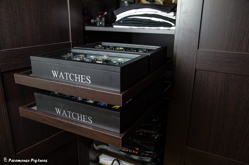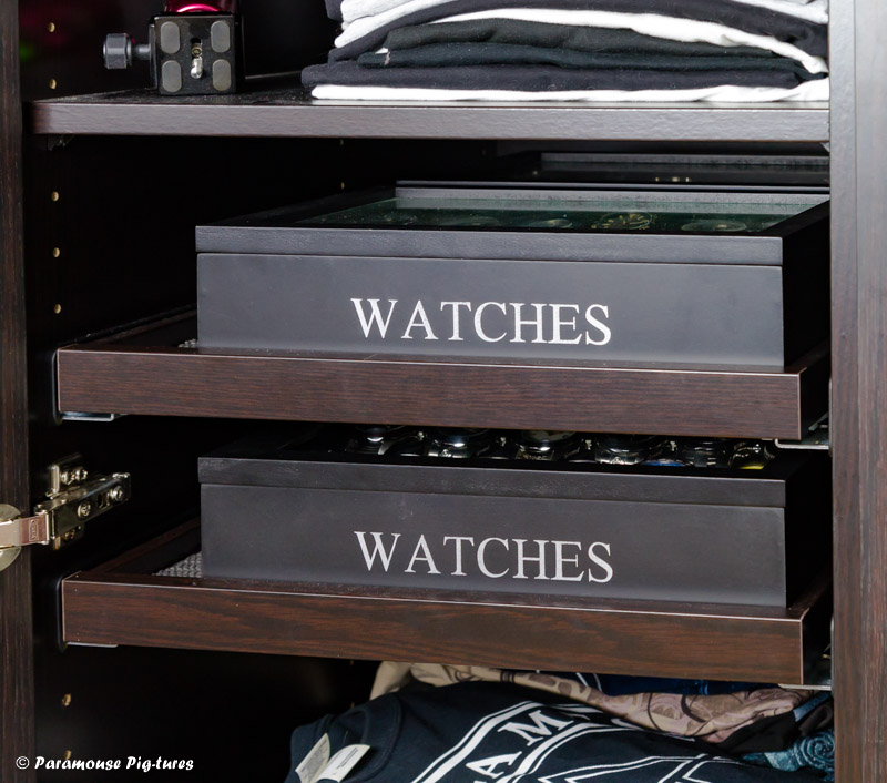 Ich entfernte die zwei Regalböden, auf denen sonst meine T-Shirts lagen und montierte die neuen Ausziehböden. Auf den Untersten kamen die T-Shirts in zwei Stapeln hintereinander. Durch den Ausziehboden komme ich trotzdem an den hinteren Stapel recht gut ran. Darüber kamen die beiden anderen Ausziehböden, mit gerade so viel Abstand voneinander, dass man noch die Uhrenboxen drauf parken kann. Damit diese nicht herumrutschen, kam noch eine spezielle Schaumgummimatte auf die Böden.