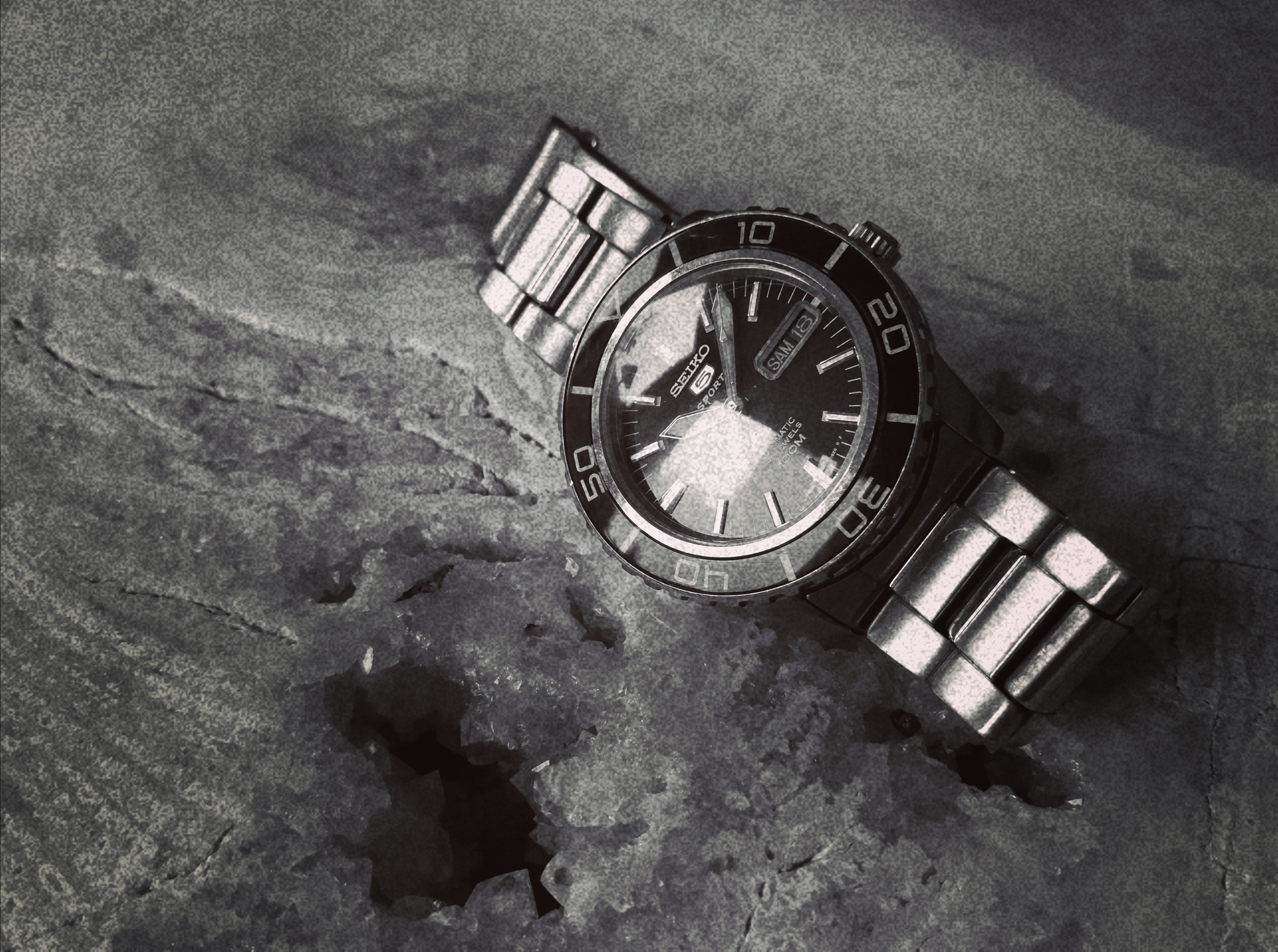 Irgendwie musste ich eben noch ein bisschen spielen mit der Uhr des Tages... Also Kontraste erhöht, etwas Rauschen/Körnung reingebracht, Schärfe rausgenommen, farblich auf Vintage getrimmt, Tada, Bild: