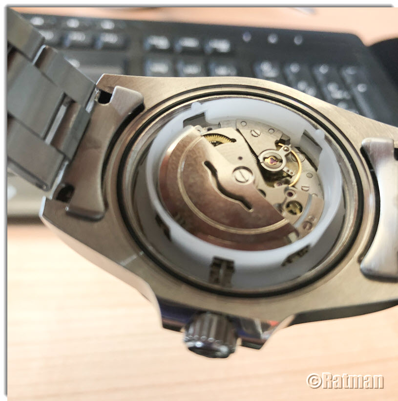 Der Rotor zeiht das Werk nur einseitig auf. Im Freilauf rattert er dagegen wie ein Trecker und versetzt ab einer gewissen Drehzahl die Uhr in heftige Schwingungen. Hoffentlich fallen dadurch bei dieser Uhr nicht auch noch die Indizes ab
