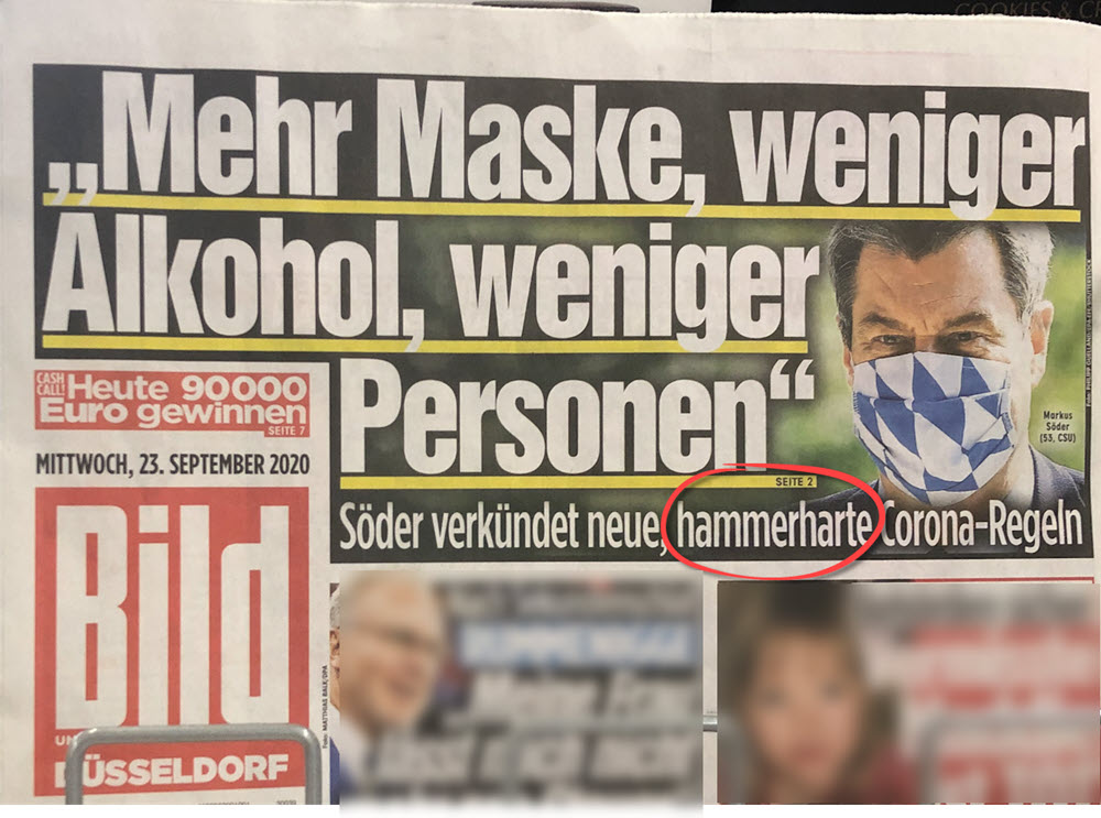 24 Sep. 2020 15:59 - 24 Sep. 2020 16:02Nee ehrlich, Wenn das für den Söder (oder die BLÖD-Zeitung) schon etwas Schlimmes ist, Maske zu tragen, auf Alkohol zu verzichten und Abstand zu halten..... Was soll das erst mal geben, wenns mal richtig hart auf hart kommt?