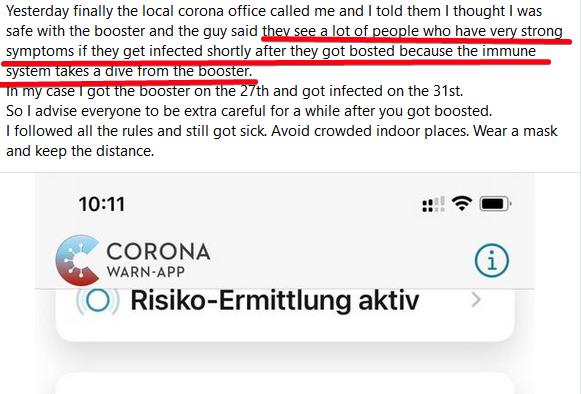 Bei meiner Warnung ging es halt speziell um eine Infektion, die sich bitte nicht mit dem Booster überschneiden sollte, denn der Körper ist locker 7-14 Tage damit beschäftigt, sich um die Booster zu kümmern, wenn genau DANN noch einen Infektion (welcher Art auch immer!) hinzukommt, kann es Probleme geben.
