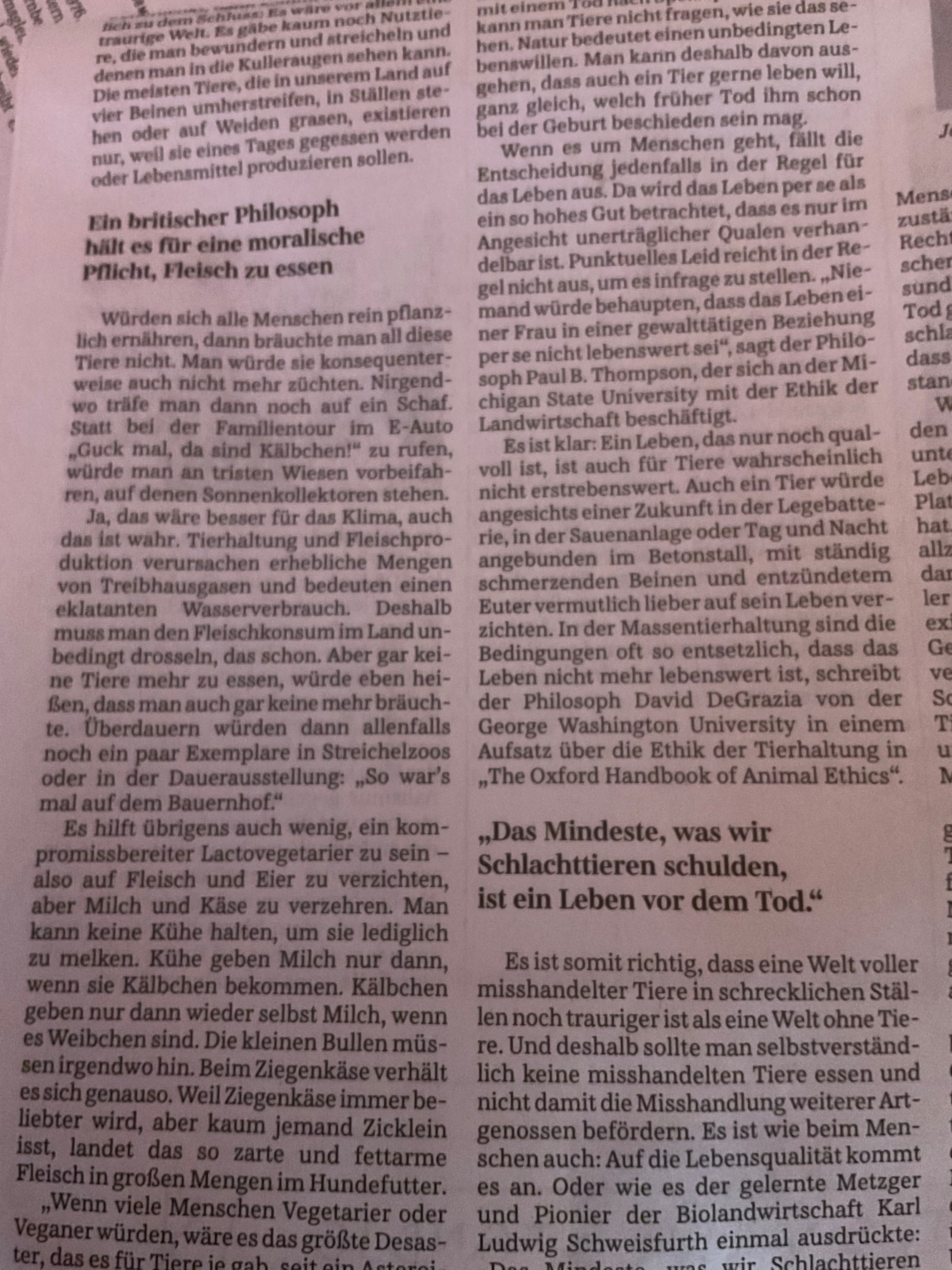 Was der Herr Philosoph mal bedenken sollte: Darf der Mensch sich anmaßen, über Leben und Tod eines anderen Lebewesens zu entscheiden? Darf er einem Lebewesen ein Leben in Qual und Schmerz aufzwingen, nur um seine Lust auf Fleisch zu befriedigen? Ich glaube, von einem ethischen oder moralischen Standpunkt aus betrachtet, eher nein.