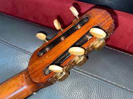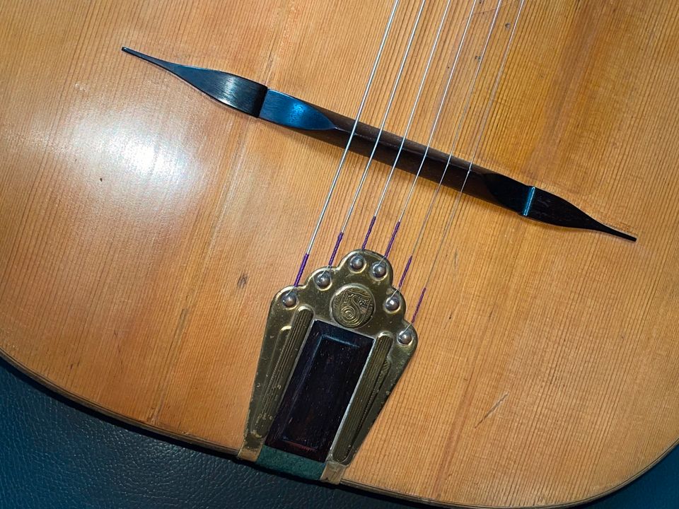 Sie hat zwei alte sehr professionell reparierte Deckenrisse und ist sonst in exzellenter Verfassung. Sie wurde schon einmal neu bundiert und hat eine neuere Brücke. Sonst ist alles original (Tailpiece, Endpin, Mechaniken) Sie spielt sich wie ein Traum und hat einen offeneren, weiten Klang im Vergleich zur Oval Hole.