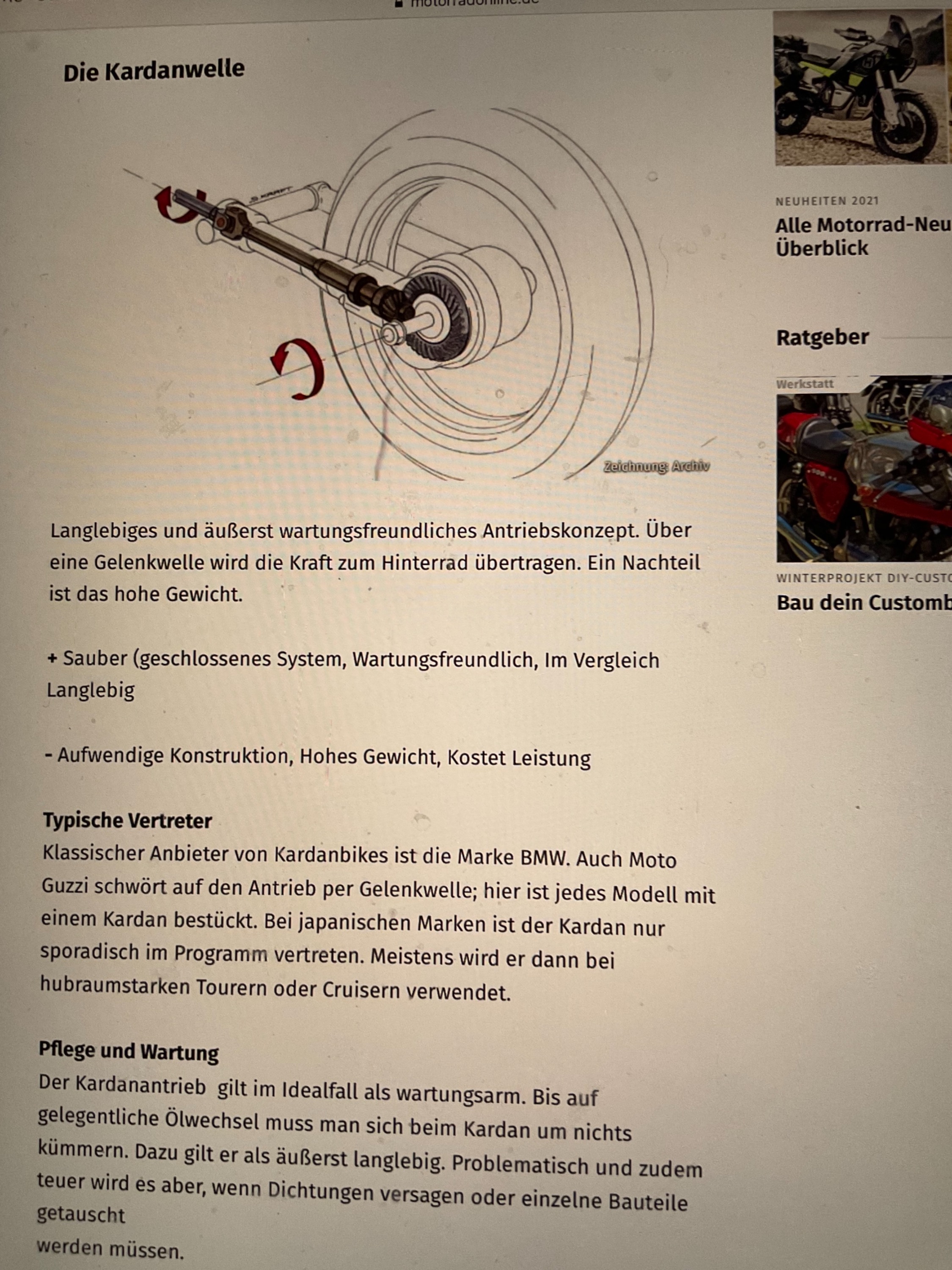 Meine Kaufentscheidung war in erster Linie der Kardanantrieb-ein Motorrad mit Kette ist für mich ein Relikt aus den Mittelalter-dies finde ich wäre eine eigene Diskussion wert!