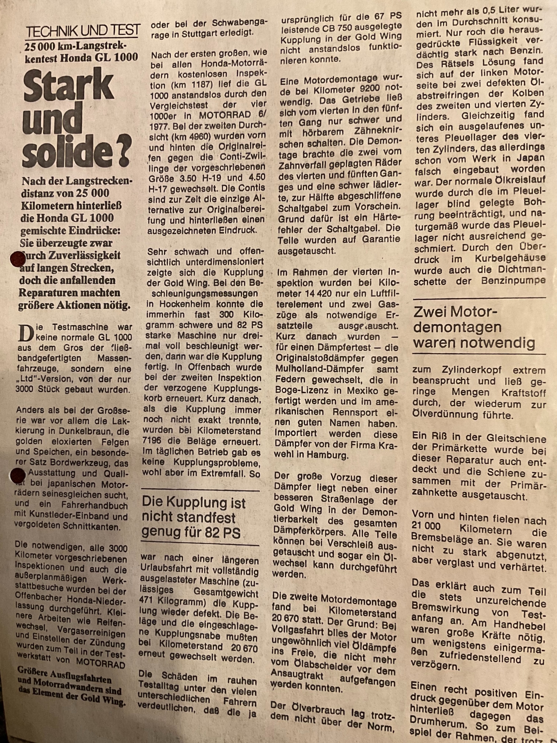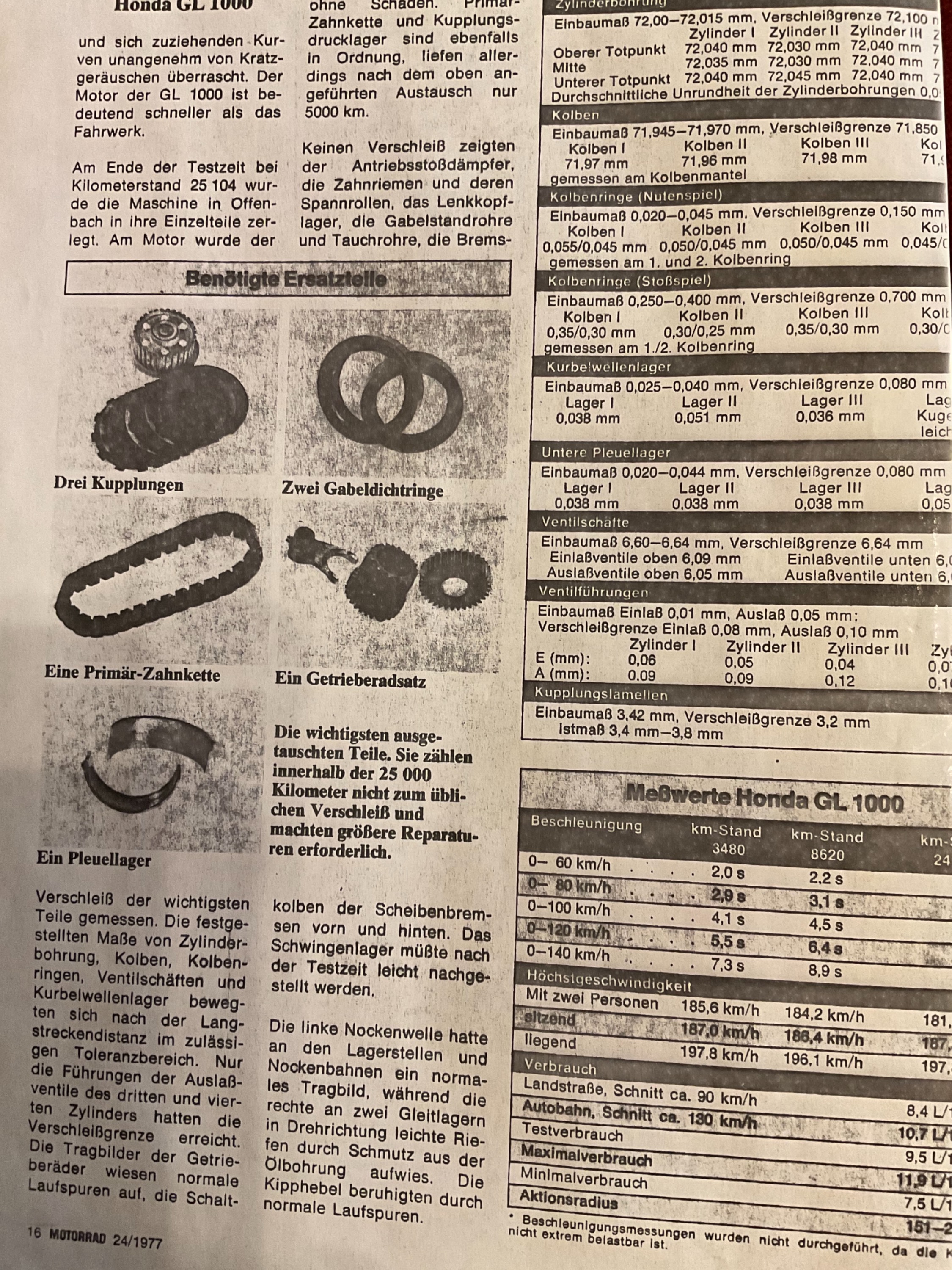 Die Kupplungsschäden im Langzeittest kann ich übrigens nicht bestätigen. Während im Test die Kupplung bereits nach drei Beschleunigungsversuchen vernichtet war, hielt sie bei mir klaglos durch, obwohl ich meine GL1000 recht oft an der Ampel mit schleifender Kupplung volle Möhre beschleunigt habe.