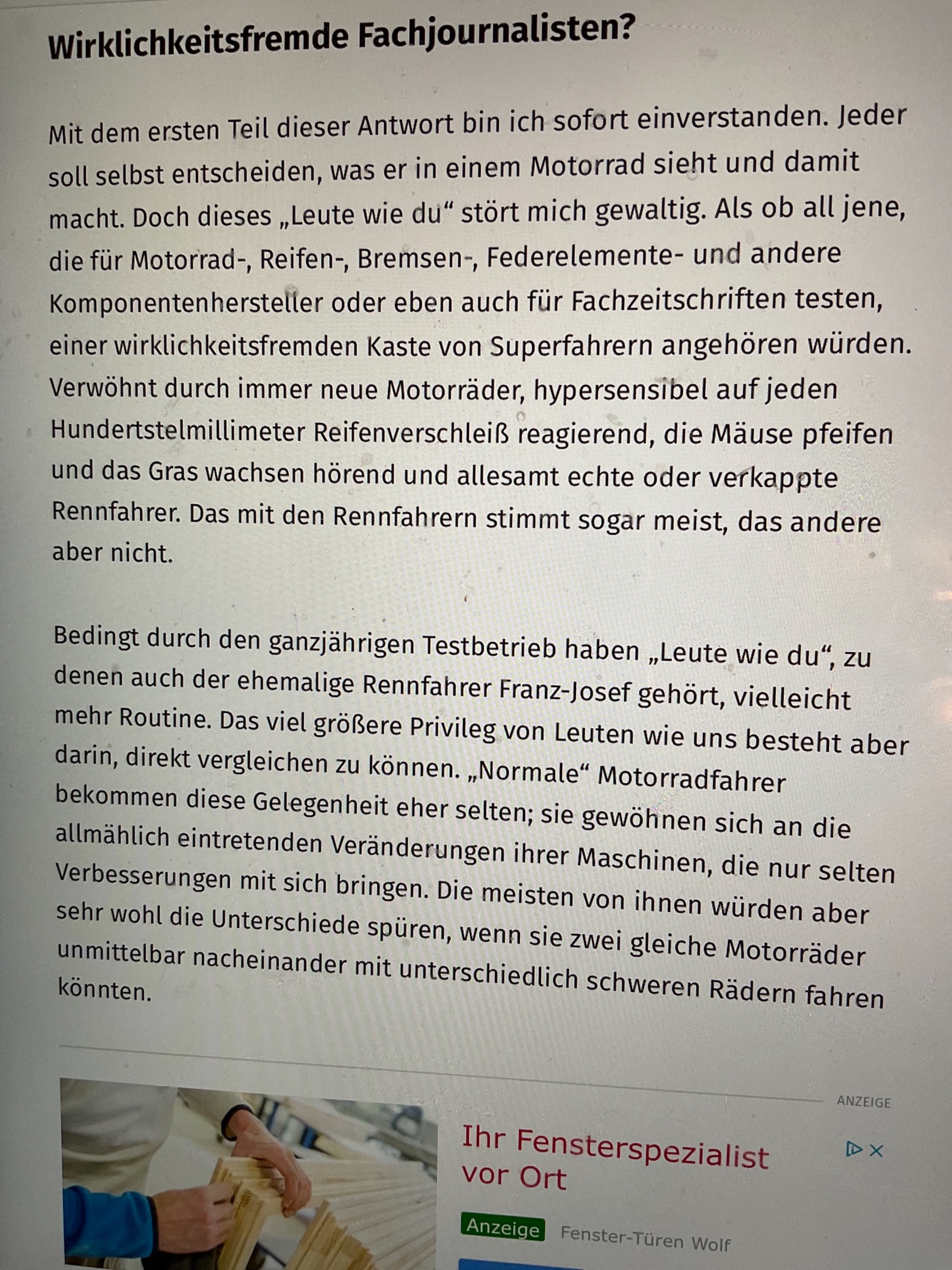 26 Jan. 2022 10:41 - 26 Jan. 2022 12:25„Die blutige Hand an der Friedhofsmauer“, oder „die Bestie vom Magdeburg“!Moin und Danke für den Zeitungsartikel, den habe ich schon eine Weile gesucht. Jetzt sollten wir doch nochmal über den Verbrauch reden. Im Langzeittest von Motorrad ist von "160-180 km/h Dauergeschwindigkeit" die Rede. Das heißt für mich aber auch mit anderen Worten, dass die Tester das arme Motorrad mit Dauervollgas über die Bahn geprügelt haben,