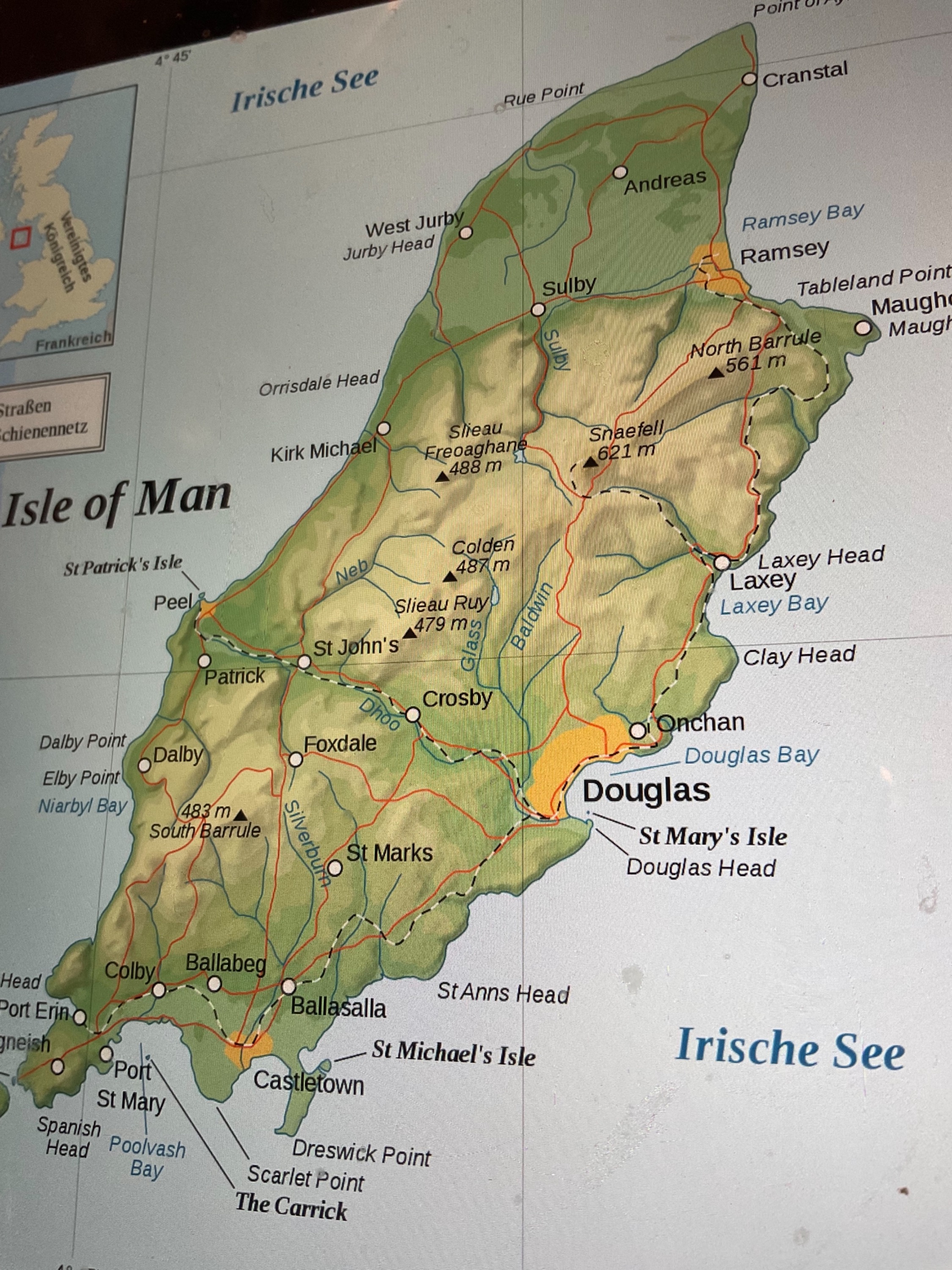 Isle of Man, ist eine britische Insel in der irischen See, der britischen Krone unterstellt, aber kein Teil des britischen Königreiches. 572 Quadratkilometer groß, 52 km lang, und 22 km breit.