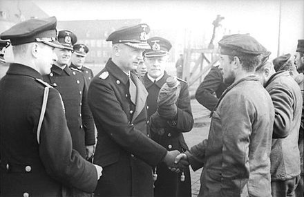 Hier ist dieser Großadmiral zu sehen, als er eine (noch) heimkommende U-Boot Besatzung begrüßt