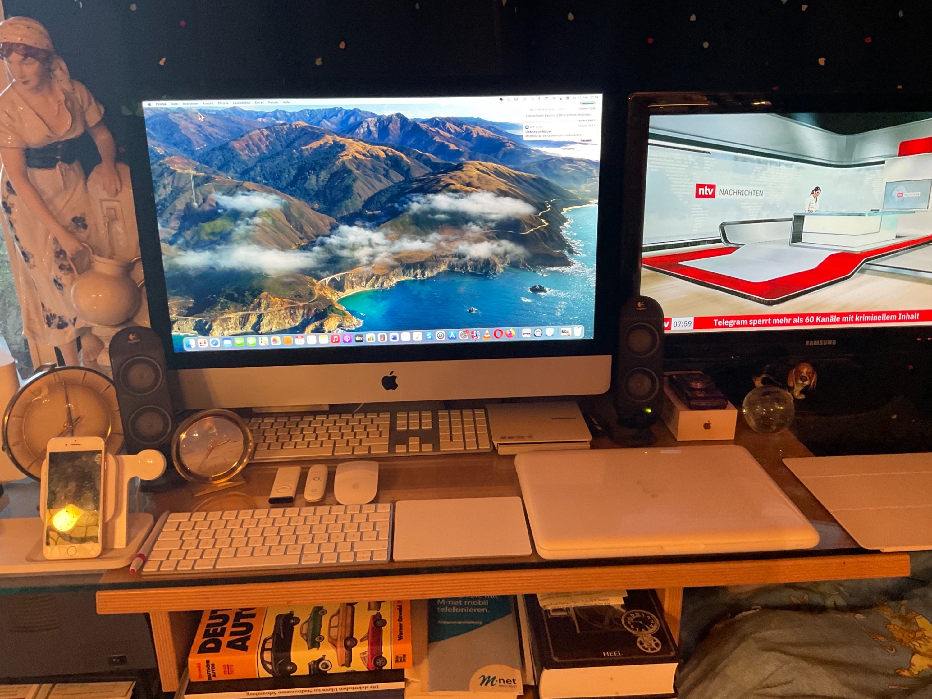 2021 kaufte ich mir dann den IMac 27“. Der Hauptgrund dafür war der große Bildschirm, und dass das ganze Kabelwirrwarr weg vom Schreibtisch war, und jetzt an der Rückseite des Monitors untergebracht ist. Der Nachteil, ich muß erst jedesmal mühsam an der Rückseite rumkramen, aber sooft ist das nicht der Fall.