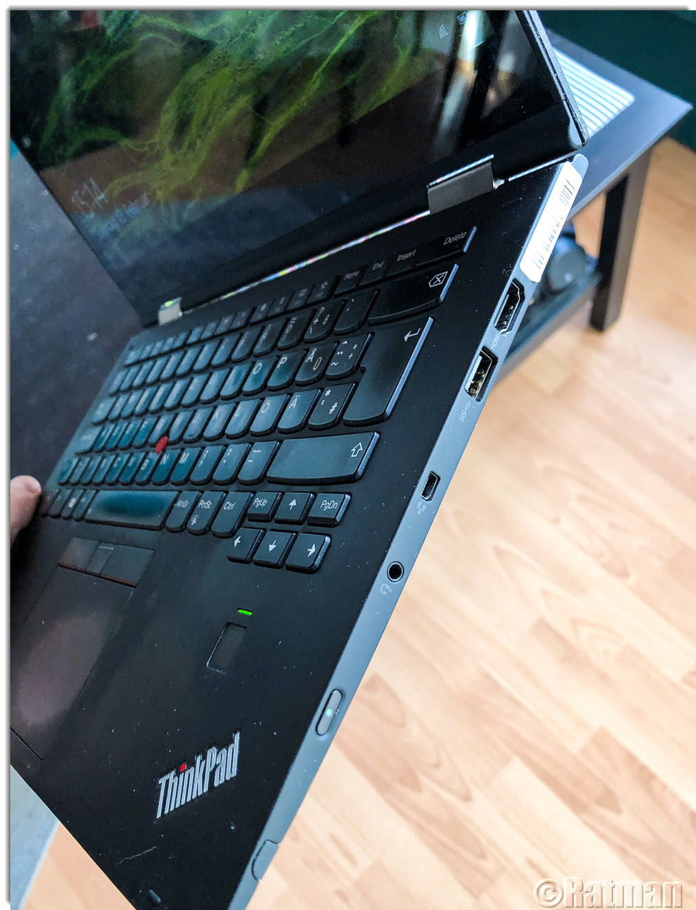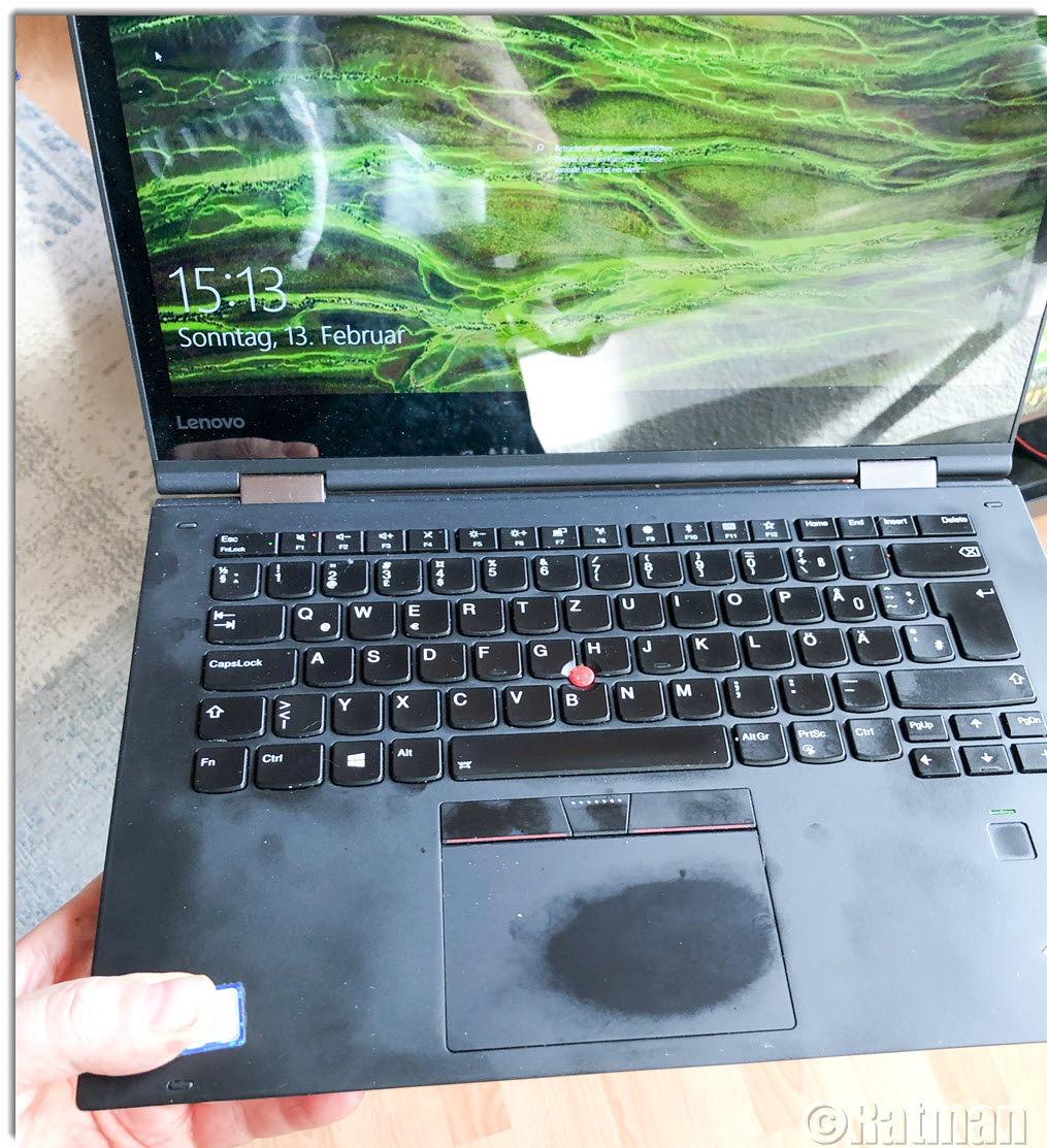 Das Smartphone-Photo läßt den Zustand schlimmer aussehen als er ist. Mit bloßem Auge sind die glänzenden Stellen auf dem Touchpad und die Fingerprints auf dem Gehäuse kaum zu sehen.