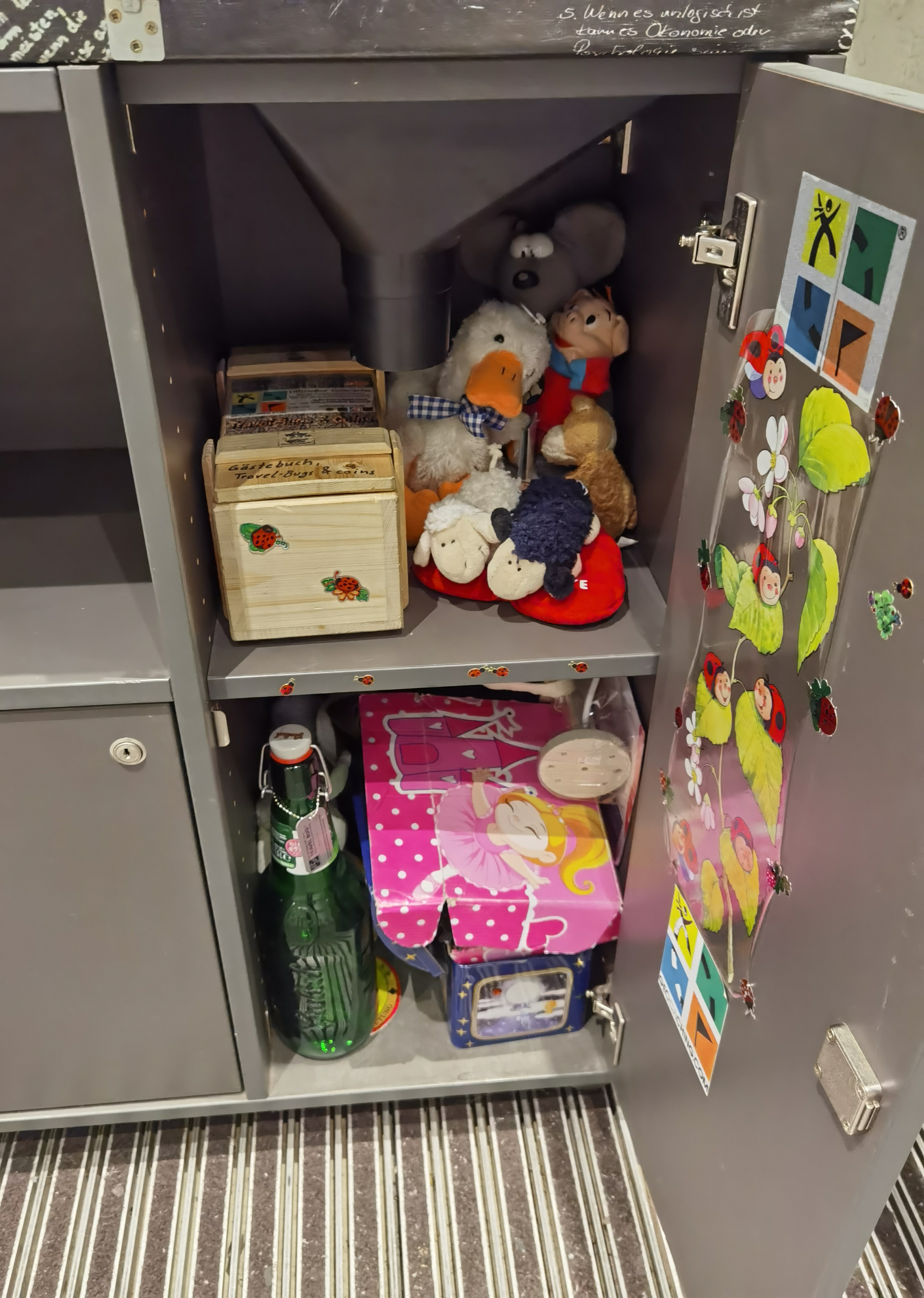 Gegenstände mit Trackingplakette (die Flasche und Dinge in der Kiste) werden halt mitgenommen und woanders eingelegt... alles andere kann getauscht werden. Ich habe hier nur etwas hinzugefügt, Kinder/Familien sollen was davon haben.