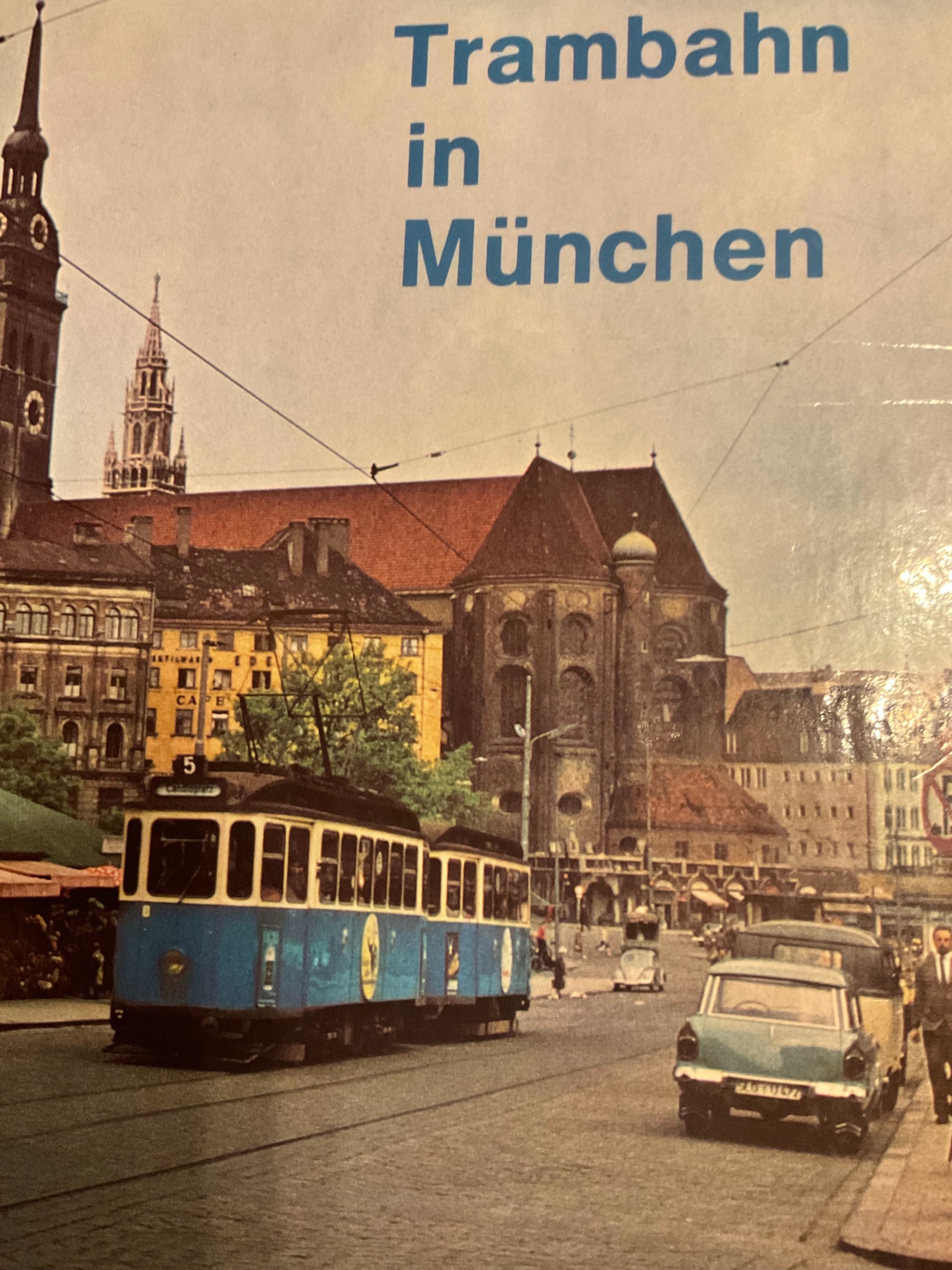 Das erste Bild zeigt die Linie 5-kurz vor ihrer Einstellung 1960- durch den Viktualienmarkt fahrend, im Hintergrund ist die Kirche „Alter Peter“ und der Turm des neuen Rathauses.