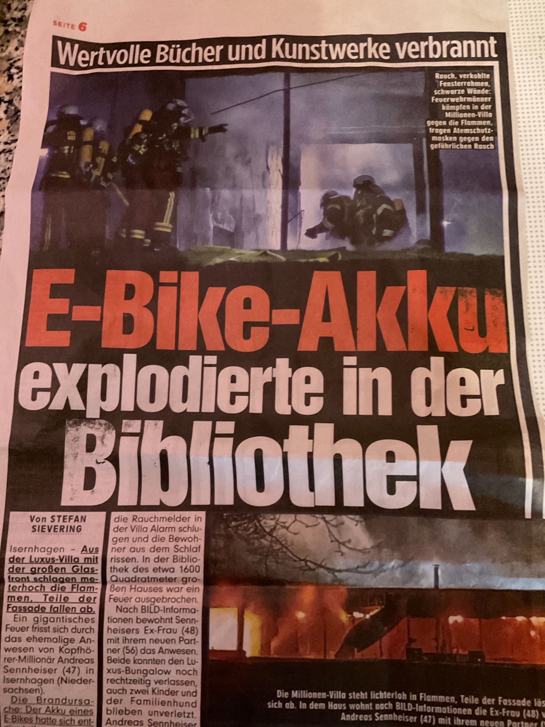 Mal wieder typisch BLÖD-Zeitung. Ich frage mich da ernsthaft, was ein E-Bike in der Wohnung oder gar in einer Bibliothek zu suchen hat. Sowas gehört in die Garage, in der außer einem Auto hoffentlich keine anderen Brandlasten gebunkert werden.