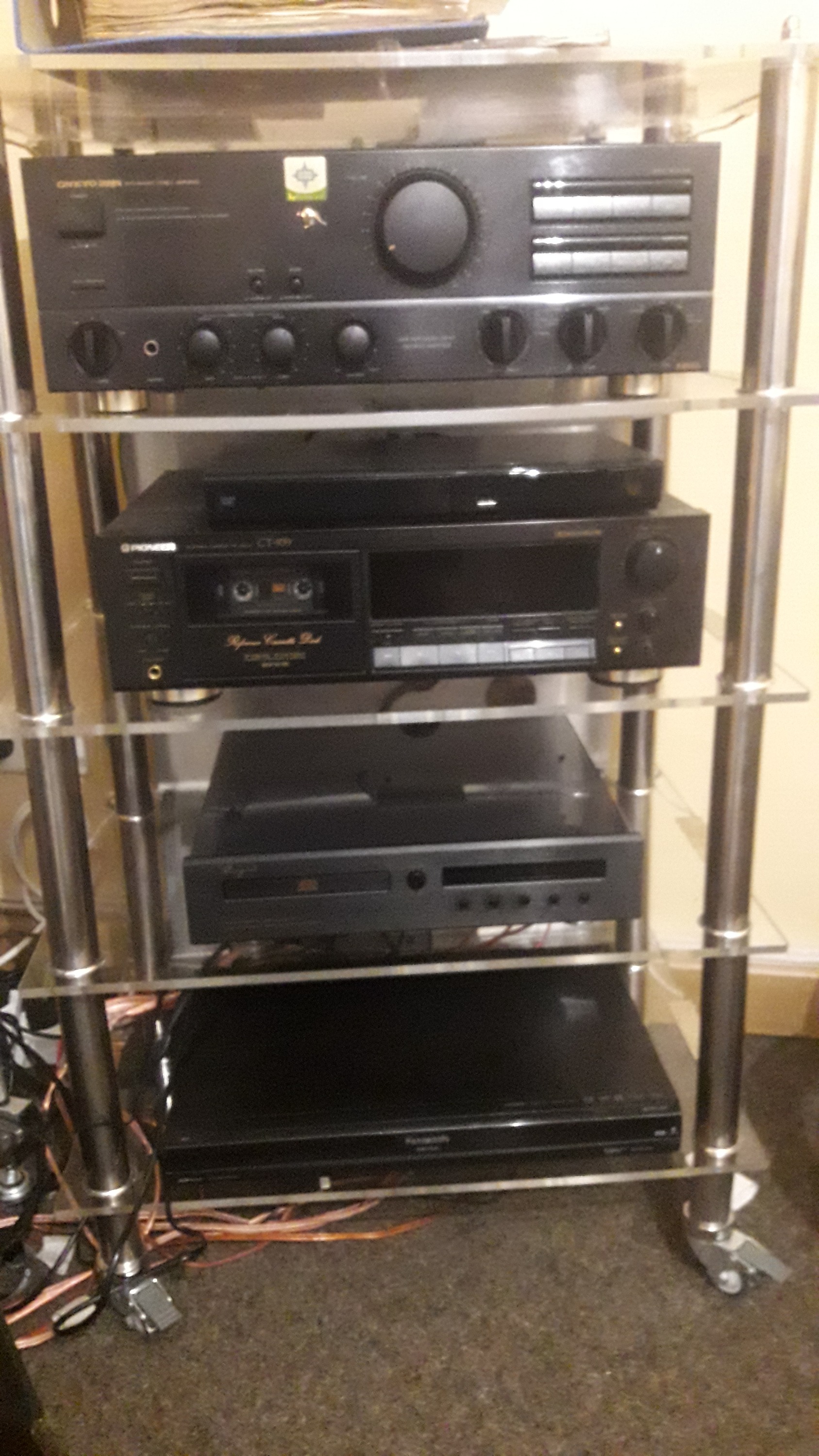 Und  hier  dazu  die   HiFi-  Ausrüstung:Von  oben  nach  unten : 1-ONKYO  Verstärker   Integra  A 8650   2-Panasonic  CD/DVD   5500    3-Pioneer  Tape  Deck   CT 939    4-Cayin  CD-Spieler   (Roehrengerät)  CS-55  CD     5- Festplattenrecorder  Pioneer  DMR EH-595