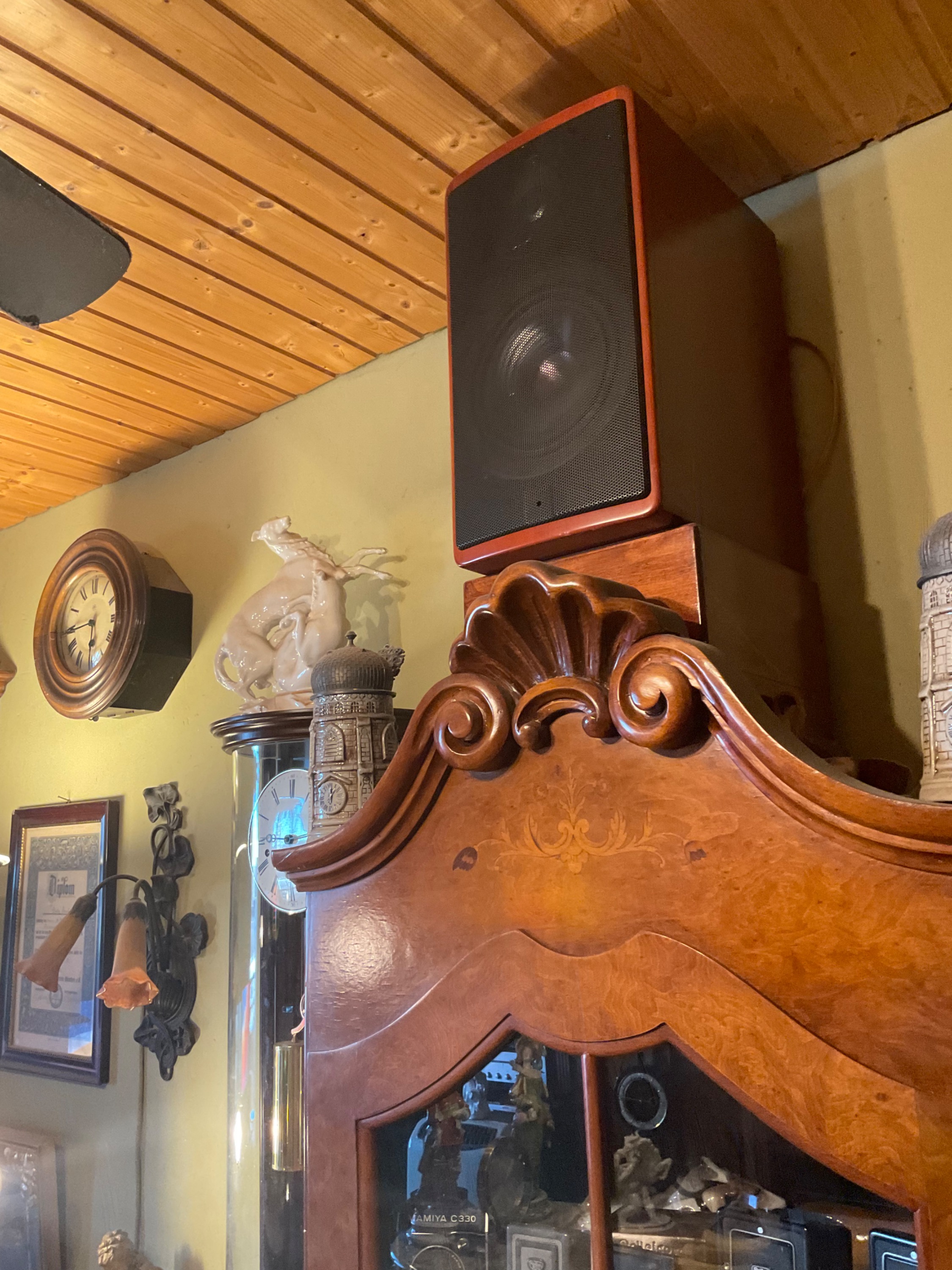 Daran hängen zwei Parkuhr-große AWD-Boxen, die ich von einem Kollegen leihweise schon seit einigen Jahren benutzen darf. Er hat keinen Platz mehr dafür :)