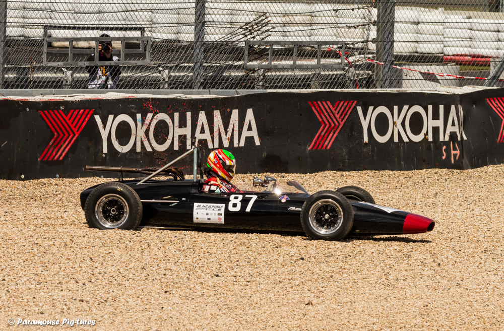 Hier kann man nochmal schön die Ausschnitte im Fangzaun sehen. Der Fotograf hatte einen guten Blick auf den gestrandeten Fahrer aus der Lurani-Trophy