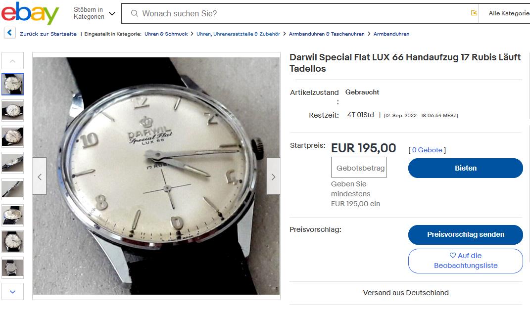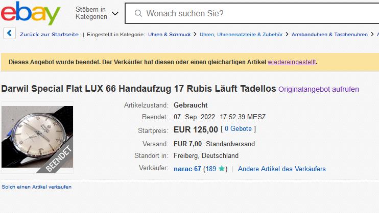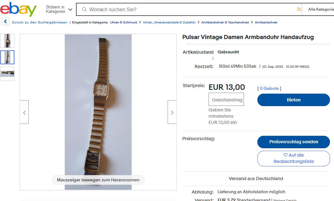 08 Sep. 2022 16:44 - 08 Sep. 2022 16:47Jemand setzt eine Uhr bei eBay zur Auktion für 125 Euro Startpreis rein, keine Gebote, er bleibt also erst einmal darauf sitzen: