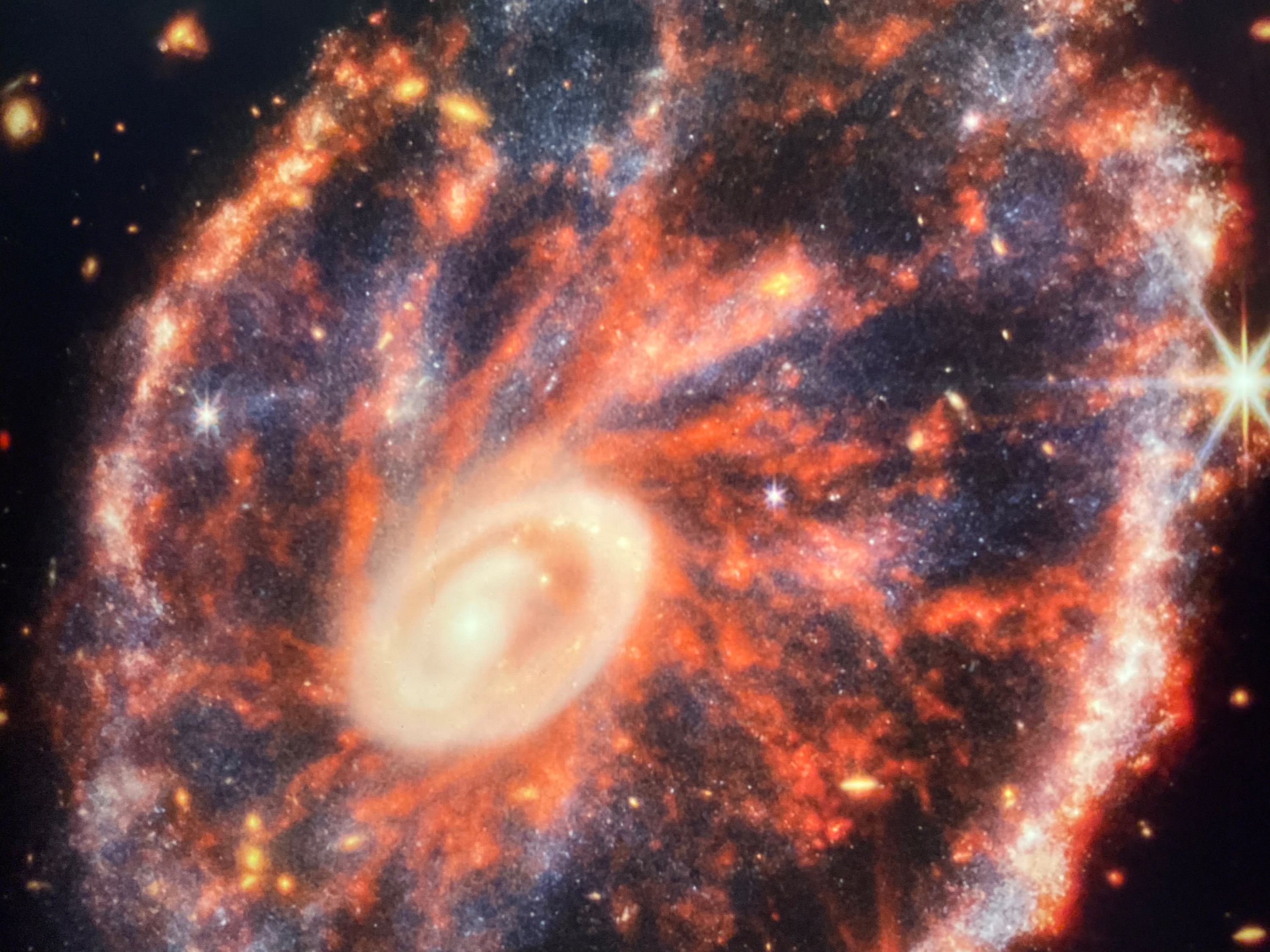 und hier ein Bild vom neuen „James Webb“ Teleskop aufgenommen, es handelt sich um die „Wagenrad“ Galaxie.