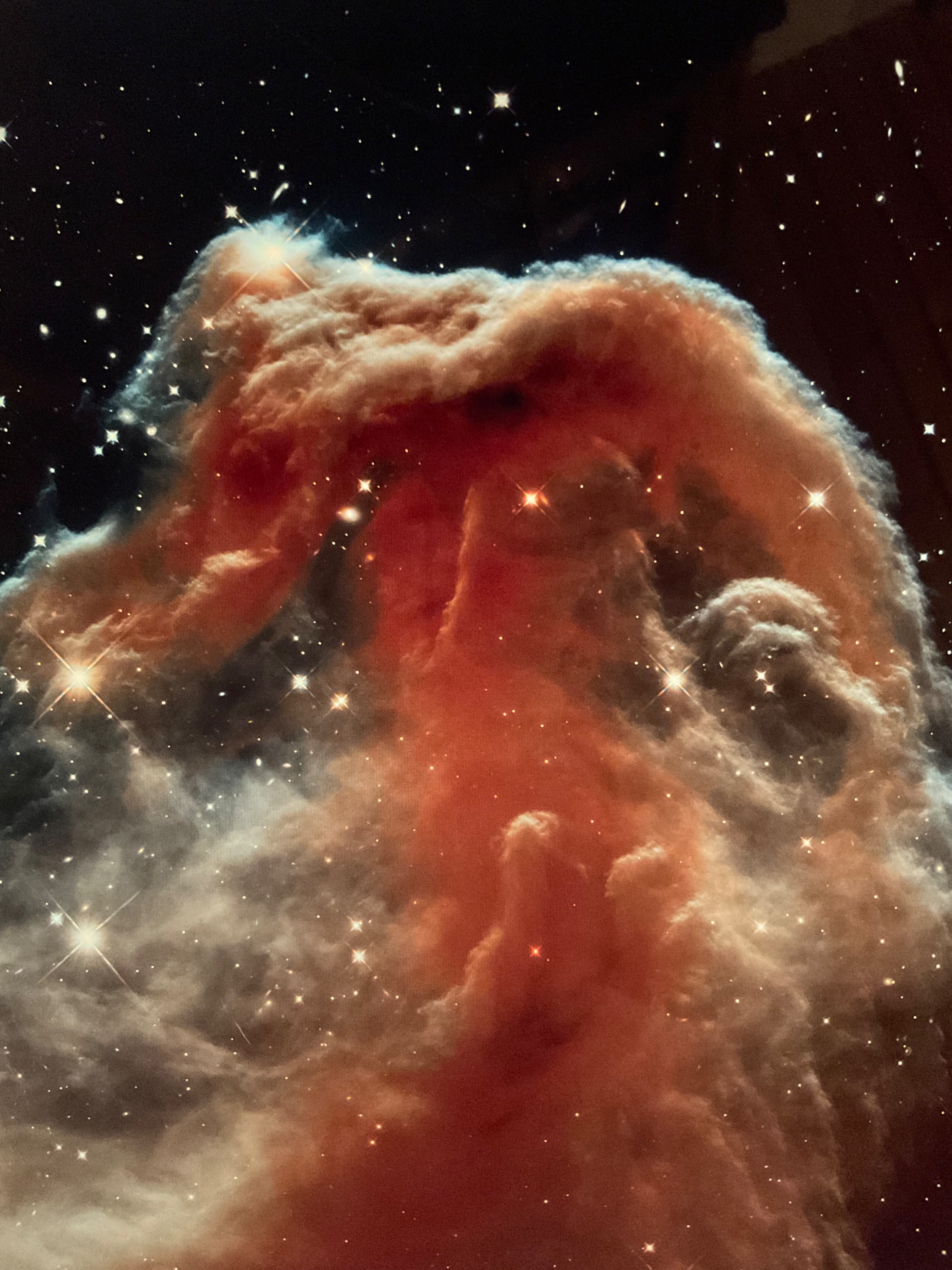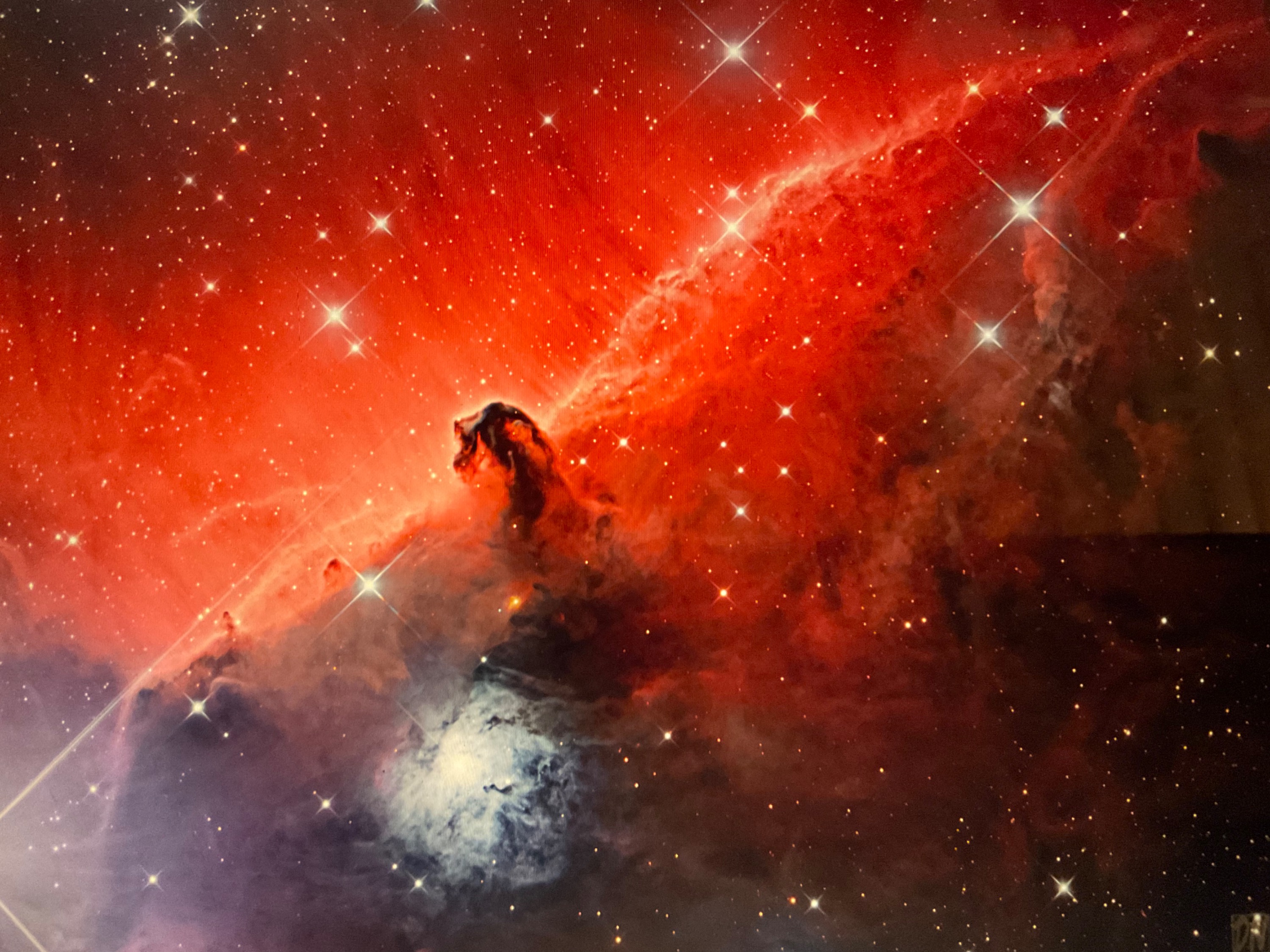 Er hebt sich vor einen rot leuchtenden Nebel ähnlich einen Pferdekopf ab, und ist von der Erde 1500 Lichtjahre entfernt!
