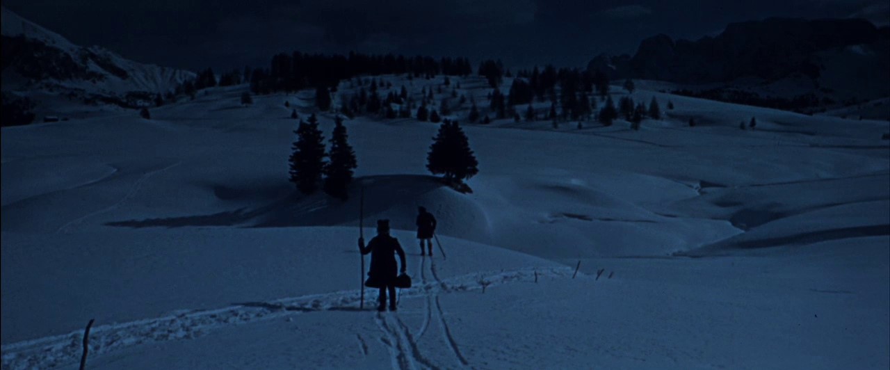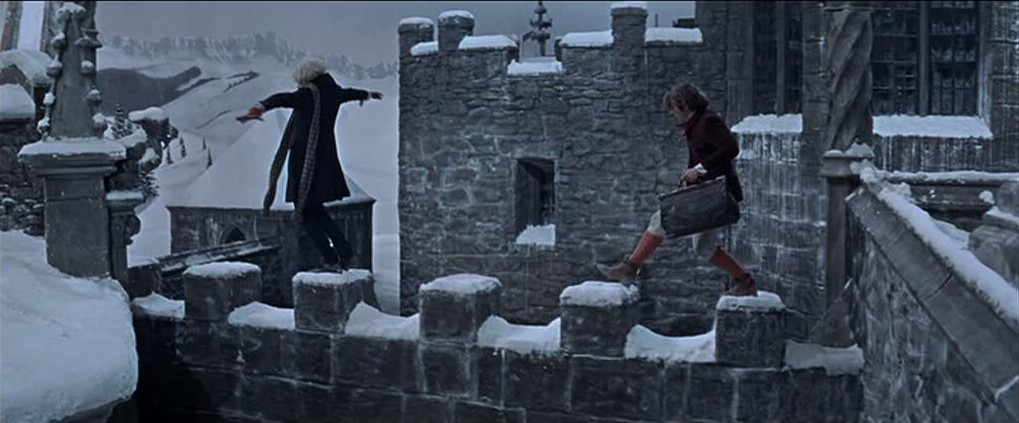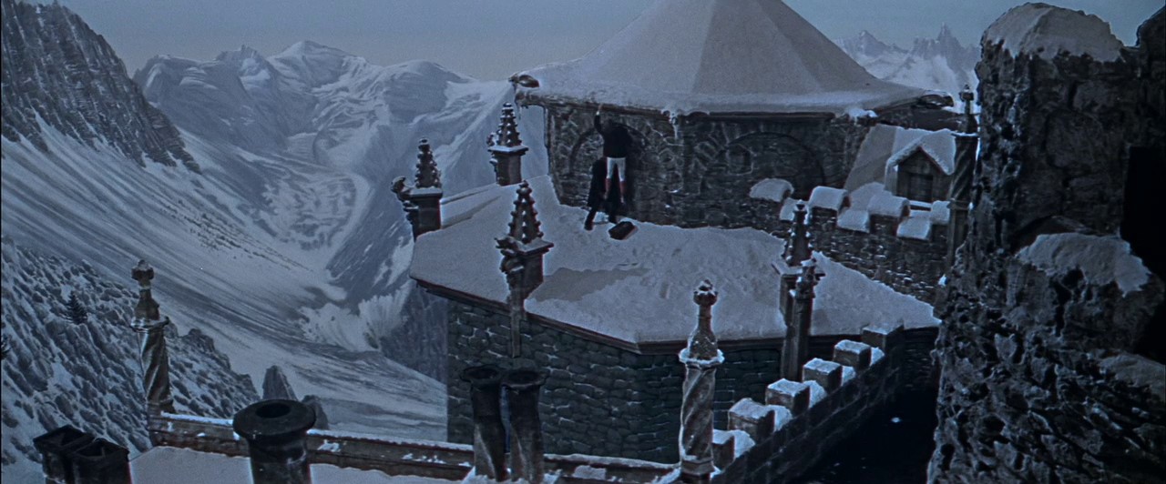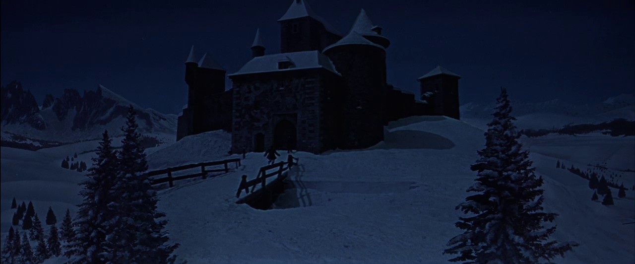 Dies ist die erste Aufnahme in dem Film aus dem sehr schön gemachten Intro. Mit der gleichen Einstellung endet auch der Film (typisch für das Frühwerk des Meister-Regisseurs). Wie die meisten anderen (sehr schön gestalteten) Winterlandschaften in dem Film, ist auch dies grossteils eine Trickaufnahme aus gemalten Landschaften (Matte-Paintings). Die Musik zu dem Film (Score) ist auch bemerkenswert (bezaubernd!) und stammt von einem der interessantesten Filmkomponisten, der leider sehr früh starb.