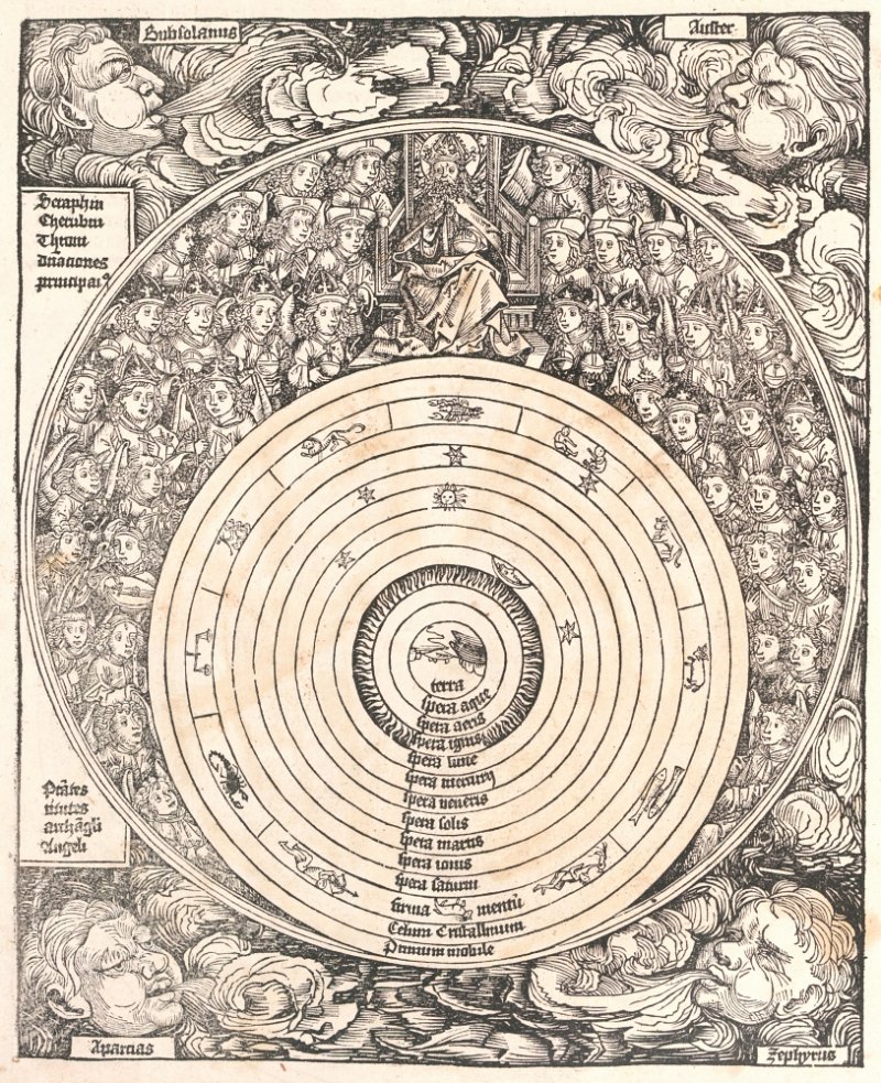 Hier wurde eine historische Darstellung zum Vorbild genommen, ein Holzschnitt aus der 'Schedelschen Weltchronik' (1493) mit der damaligen Vorstellung eines geozentrischen Kosmos ("Ptolemäisches Weltbild"). In der Mitte die Erde aus den 4 Elementen Erde, Feuer, Luft und Wasser, umkreist auf ihren Sphären von den Planeten (v.i.n.a. Mond, Merkur, Venus, Sonne, Mars, Jupiter, Saturn), dann die 'Fixsterne', bzw. die Sternbilder im Bereich der Ekliptik (Zodiak). Ganz aussen der Himmel mit Gott und den Heiligen.