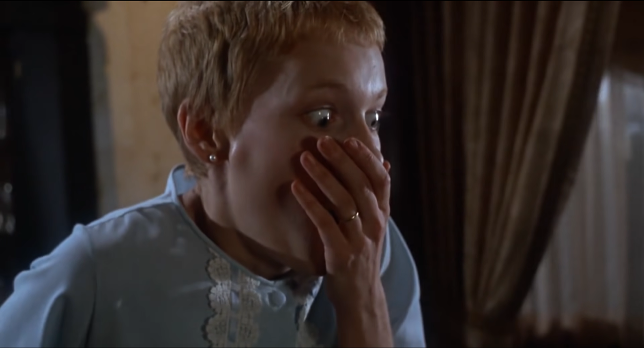 Mehr und mehr bekommt sie den Eindruck, dass alle unter einer Decke stecken und sich gegen sie verschworen haben. Sie ist ganz allein. Sind sie Satanisten? Wollen sie ihr Baby rauben und in einem Ritual opfern? Als sie schliesslich herausfindet, dass der Name ihres Nachbarn Roman Castevet ein Buchstabenversatzrätsel seines wahren Namens ist und wer er wirklich ist, wirft sie das Tanniswurzelamulett weg und flieht.